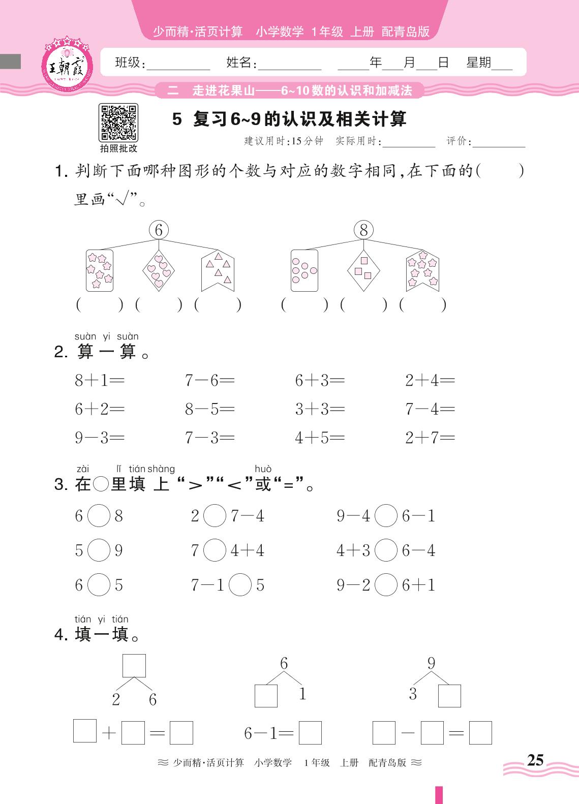 2024秋上册一年级数学青岛版 第二单元 走进花果山(6~10数的认识和加减法)——5. 复习6~9的认识及相关计算