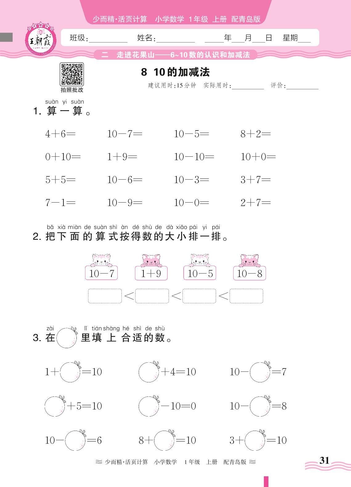 2024秋上册一年级数学青岛版 第二单元 走进花果山(6~10数的认识和加减法)——8. 10的加减法