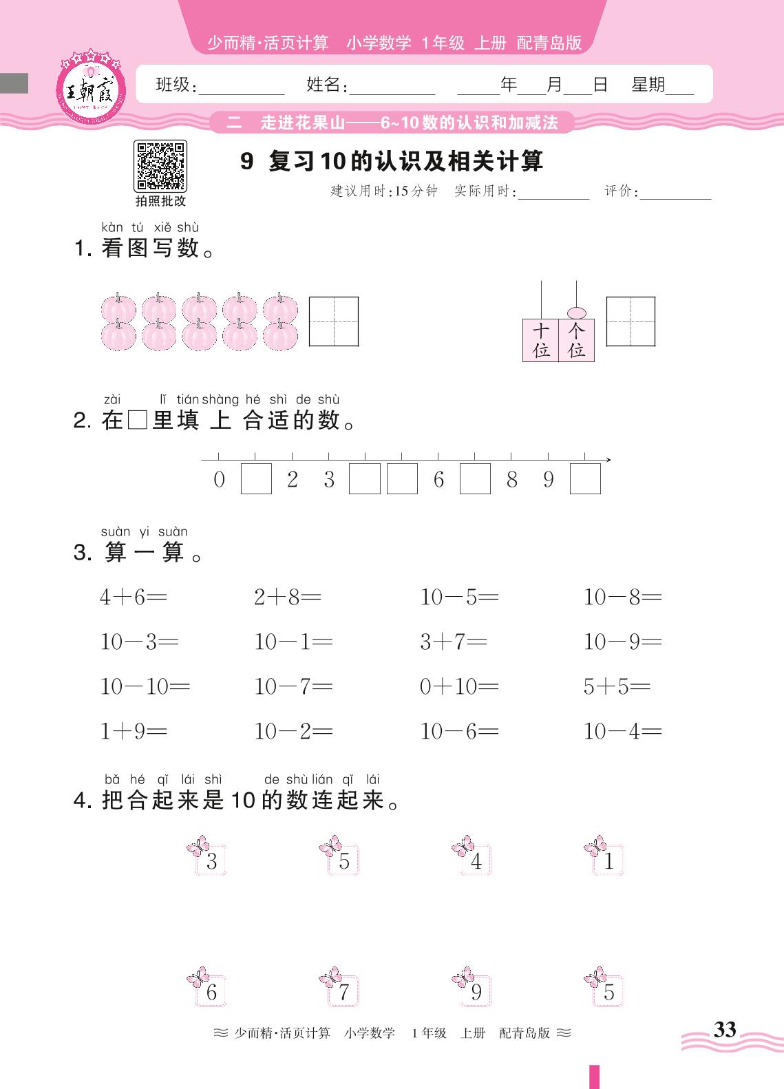 2024秋上册一年级数学青岛版 第二单元 走进花果山(6~10数的认识和加减法)——9. 复习10的认识及相关计算