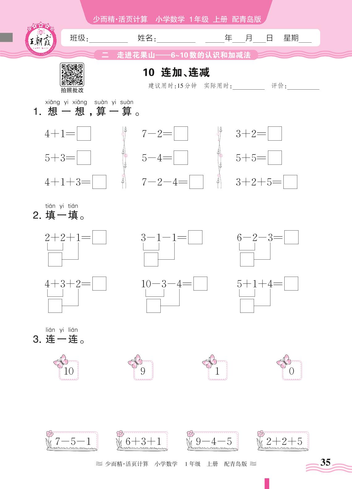 2024秋上册一年级数学青岛版 第二单元 走进花果山(6~10数的认识和加减法)——10. 连加、连减