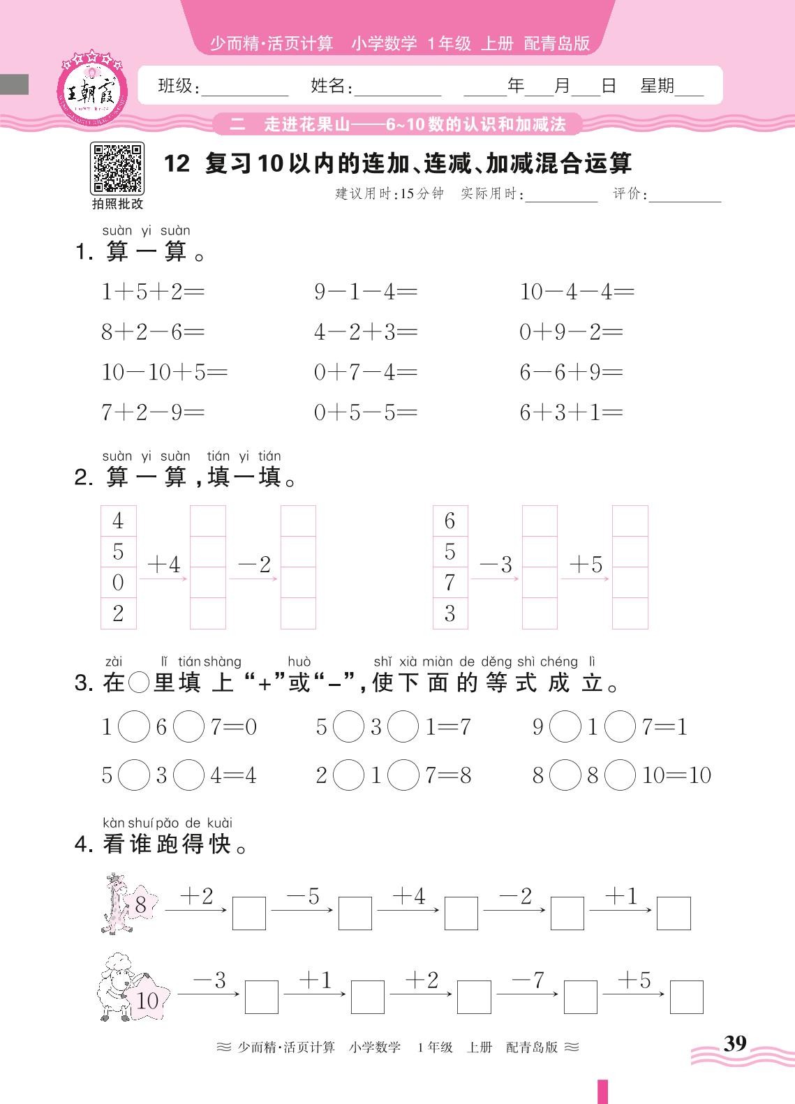 2024秋上册一年级数学青岛版 第二单元 走进花果山(6~10数的认识和加减法)——12. 复习10以内的连加、连减、加减混合运算