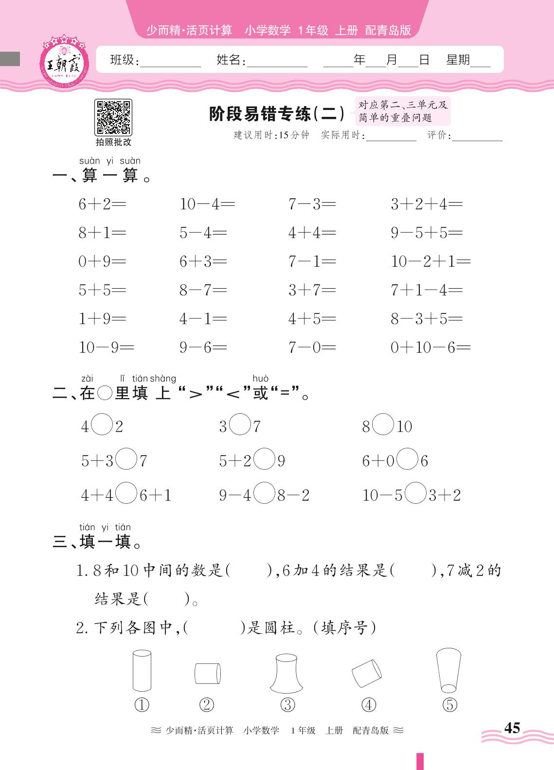 2024秋上册一年级数学青岛版 第二、三单元及简单的重叠问题 阶段易错专练