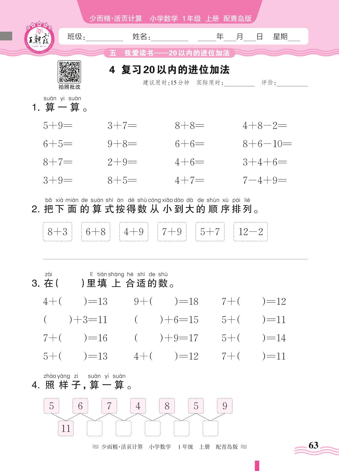 2024秋上册一年级数学青岛版 第五单元 我爱读书(20以内的进位加法)——4. 复习20以内的进位加法