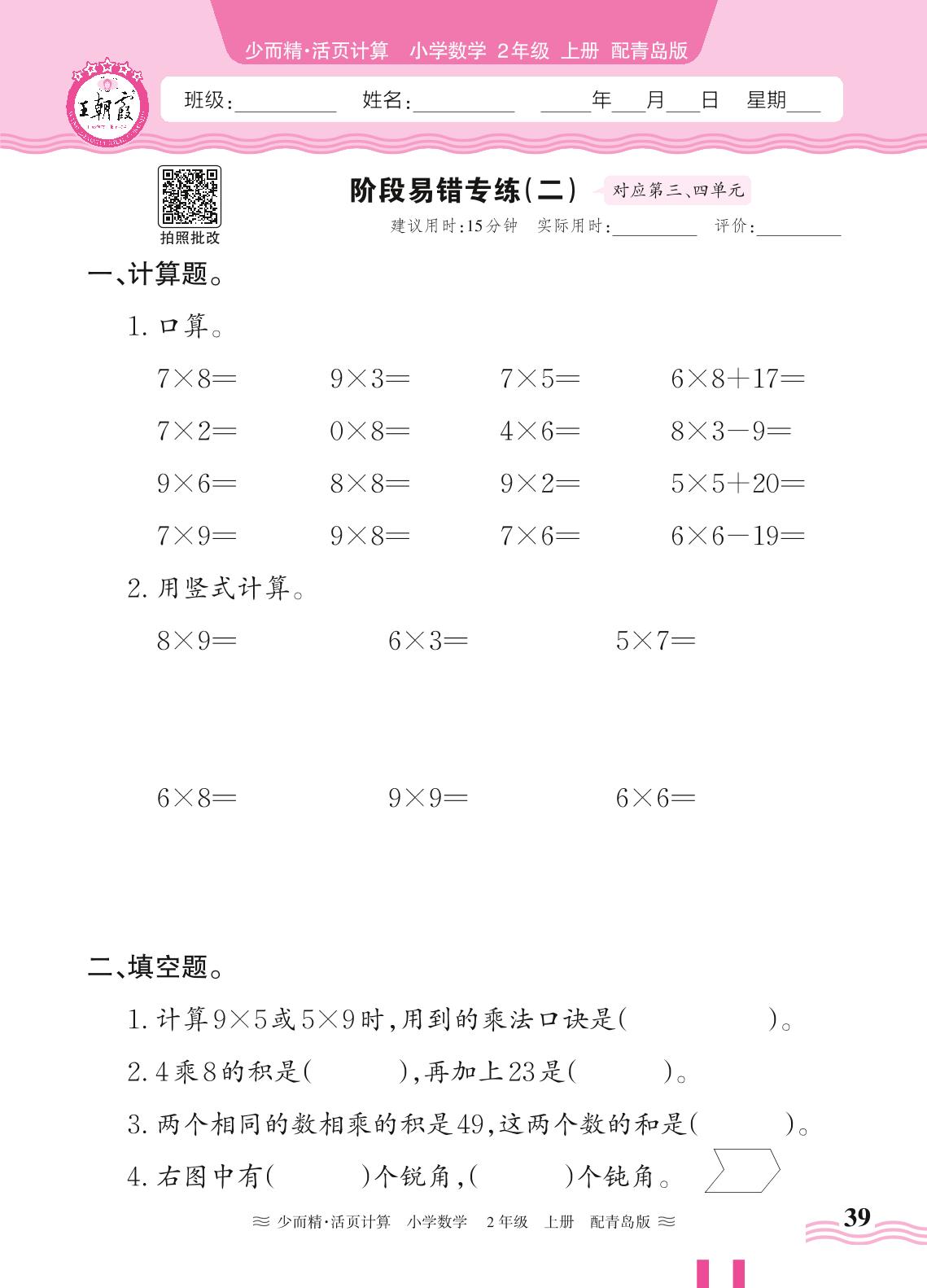 2024秋上册二年级数学青岛版 第三、四单元 阶段易错专练