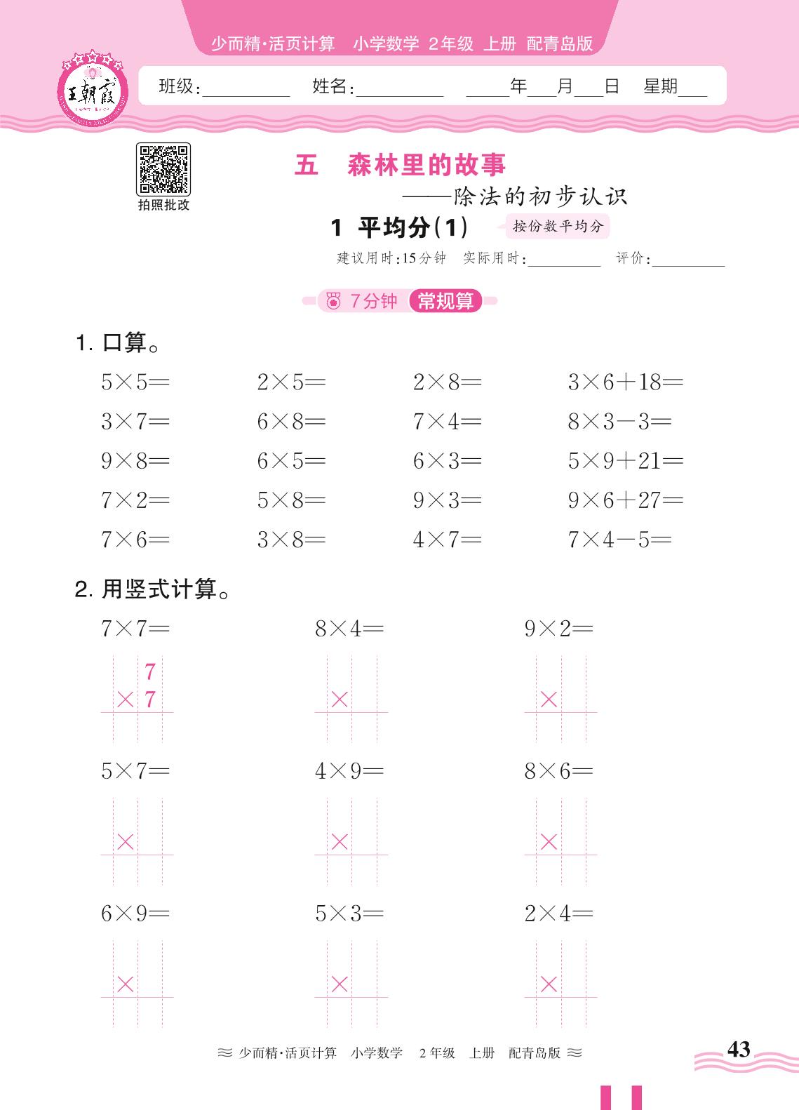 2024秋上册二年级数学青岛版 第五单元 森林里的故事(除法的初步认识)——1. 平均分(1)
