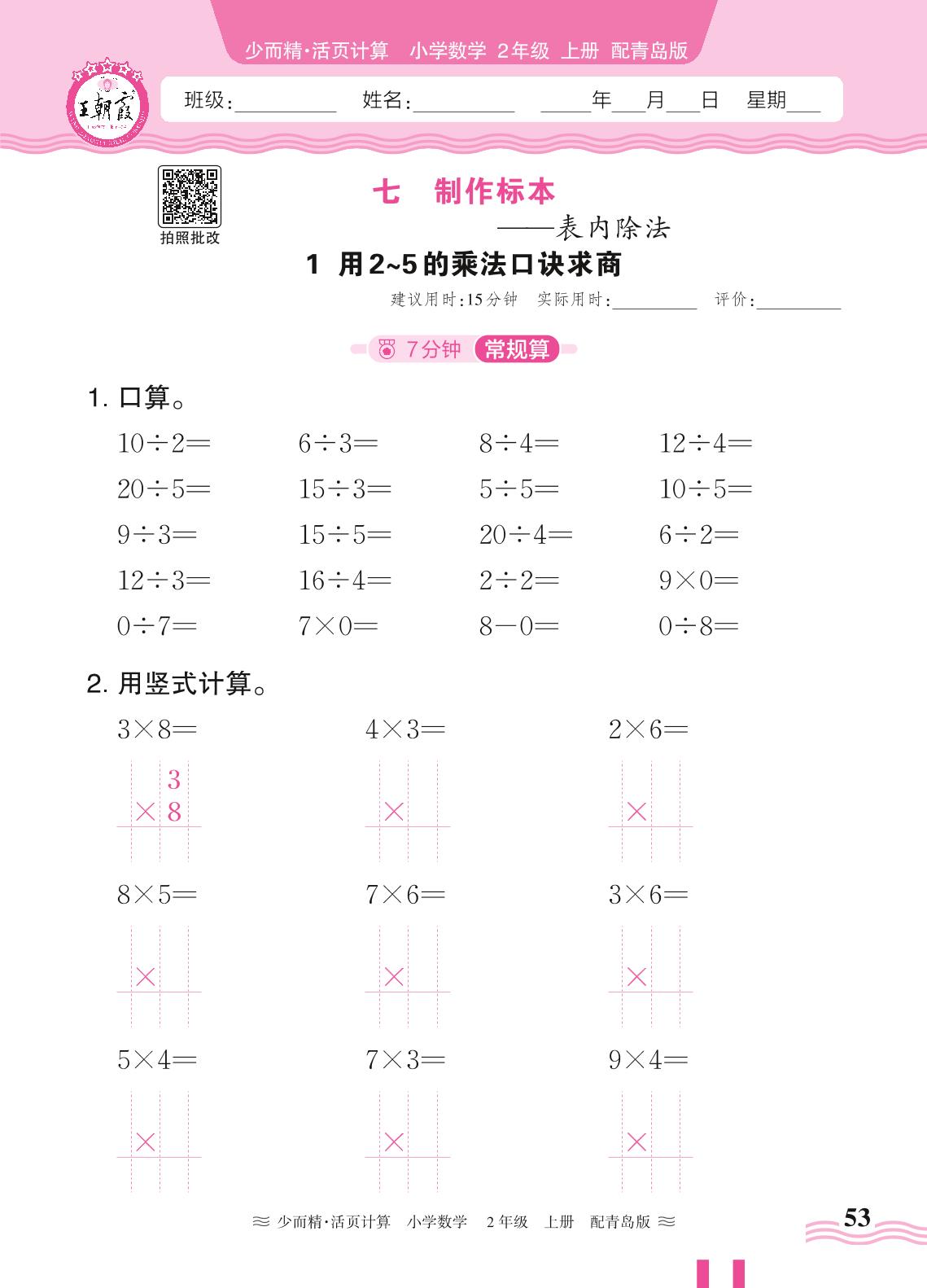 2024秋上册二年级数学青岛版 第七单元 制作标本(表内除法)——1. 用2~5的乘法口诀求商