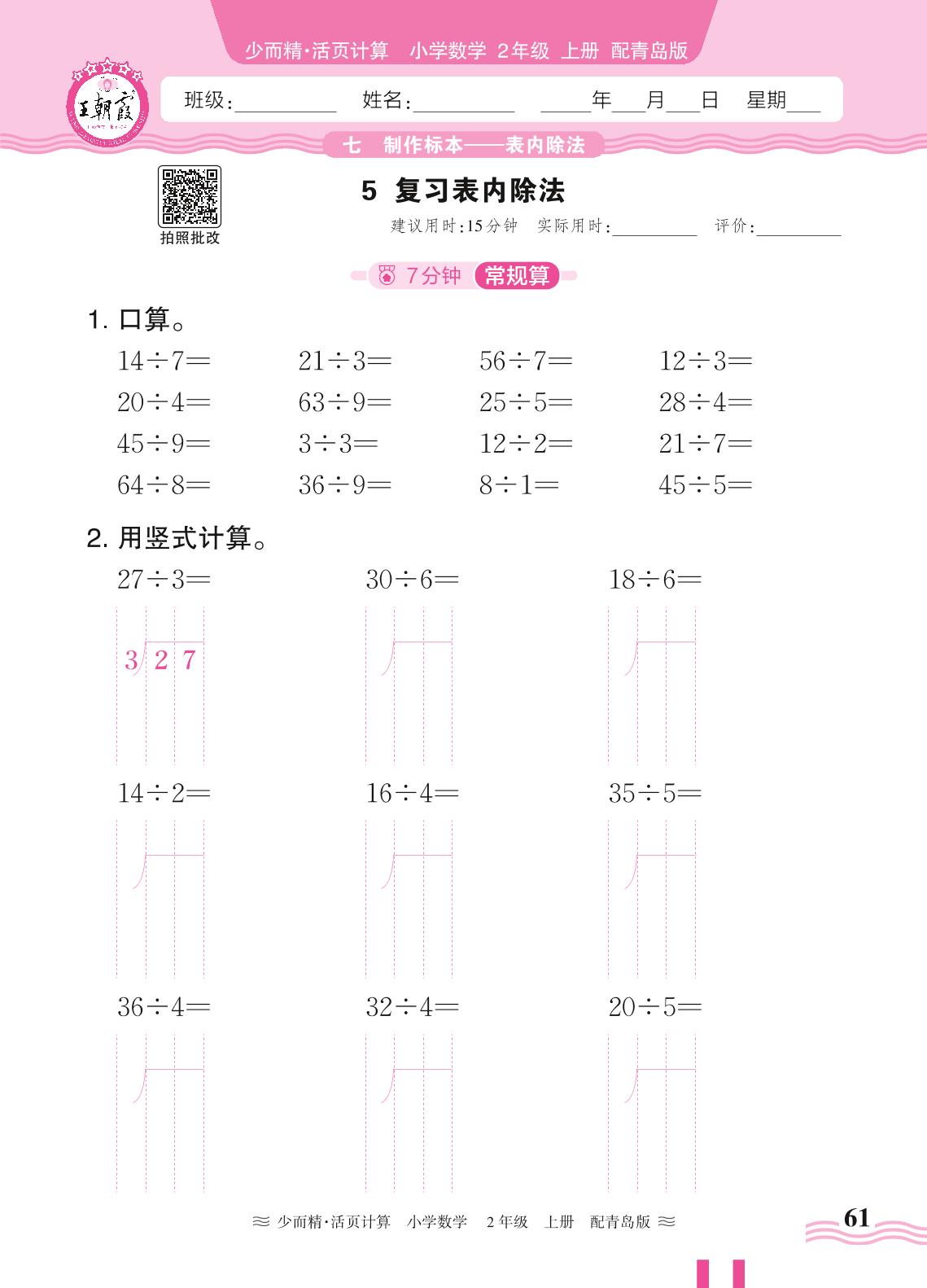 2024秋上册二年级数学青岛版 第七单元 制作标本(表内除法)——5. 复习表内除法