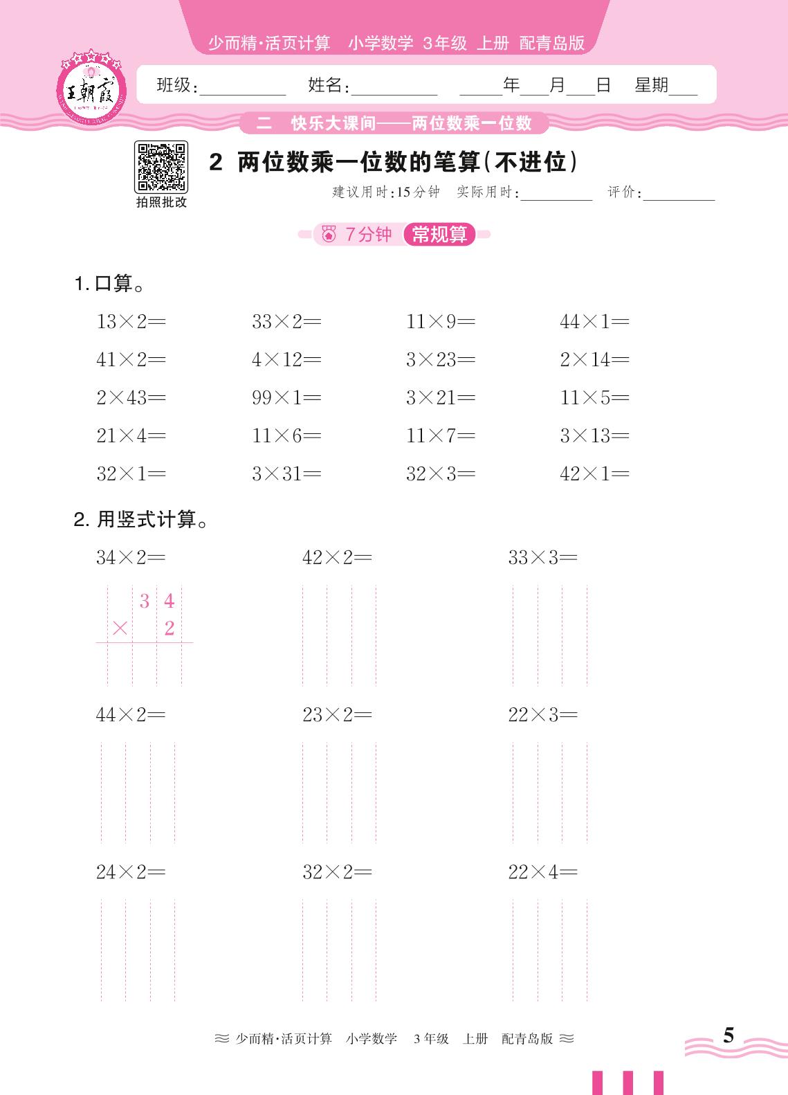 2024秋上册三年级数学青岛版 第二单元 快乐大课间(两位数乘一位数)——2. 两位数乘一位数的笔算(不进位)