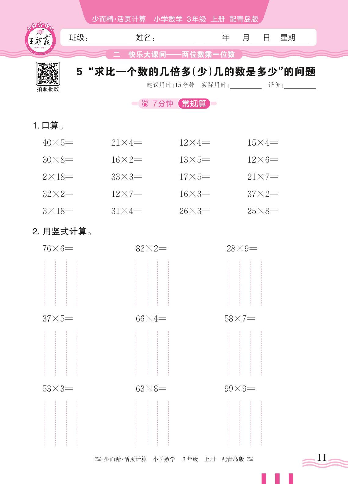 2024秋上册三年级数学青岛版 第二单元 快乐大课间(两位数乘一位数)——5. “求比一个数的几倍多(少)几的数是多少”的问题