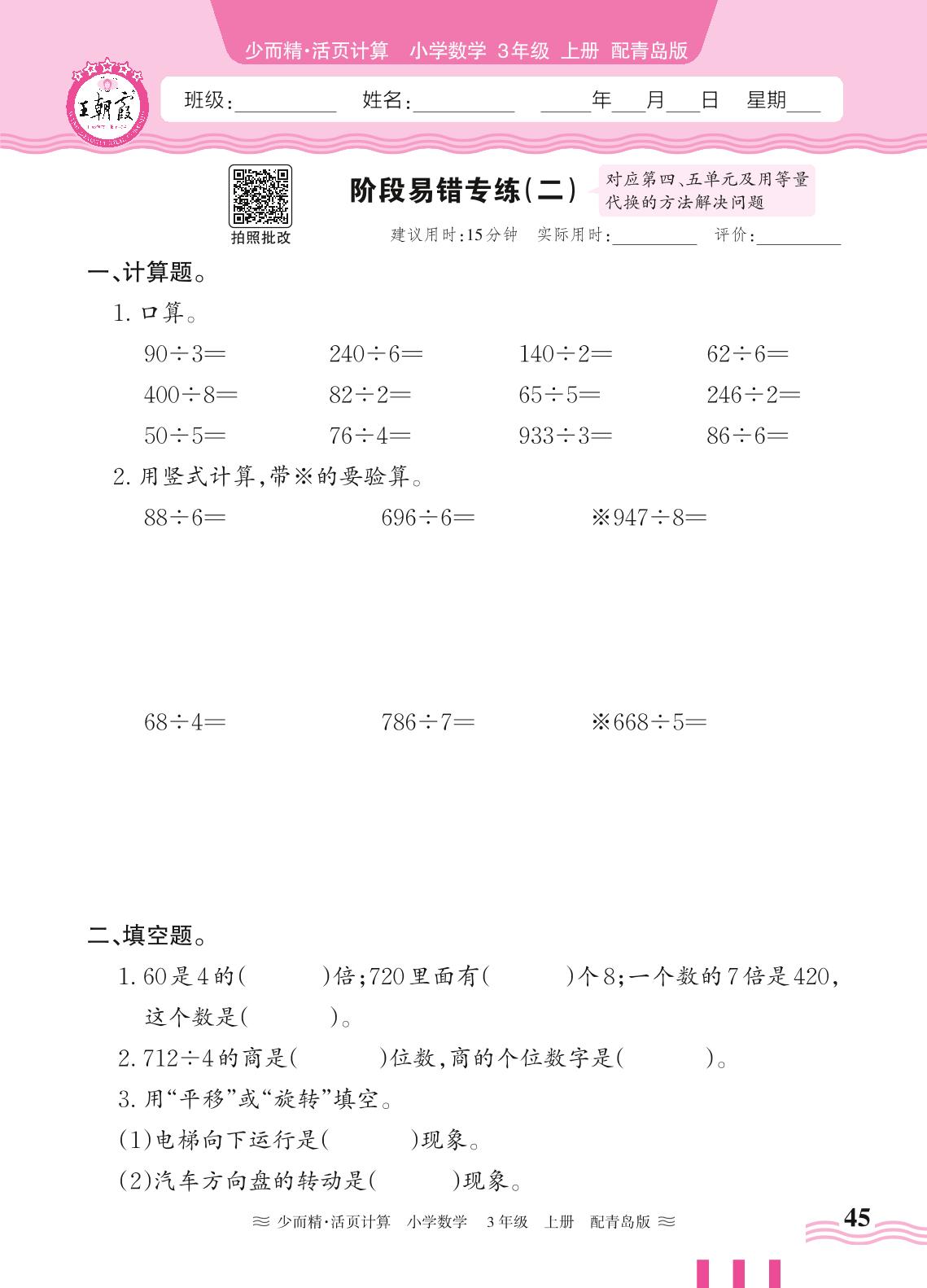 2024秋上册三年级数学青岛版 第四、五单元及用等量代换的方法解决问题 阶段易错专练
