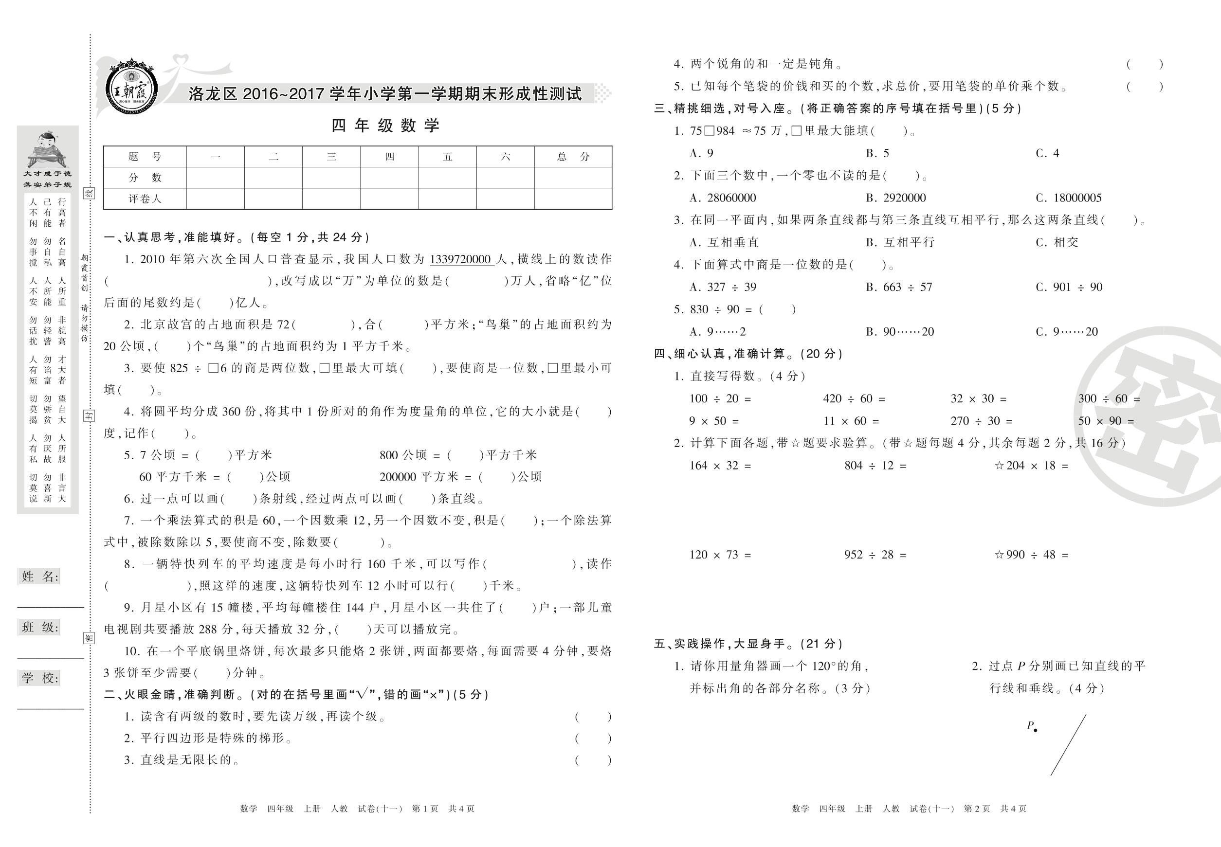 2016-2017学年第一学期洛阳市洛龙区四年级数学试卷(人教版)【11】