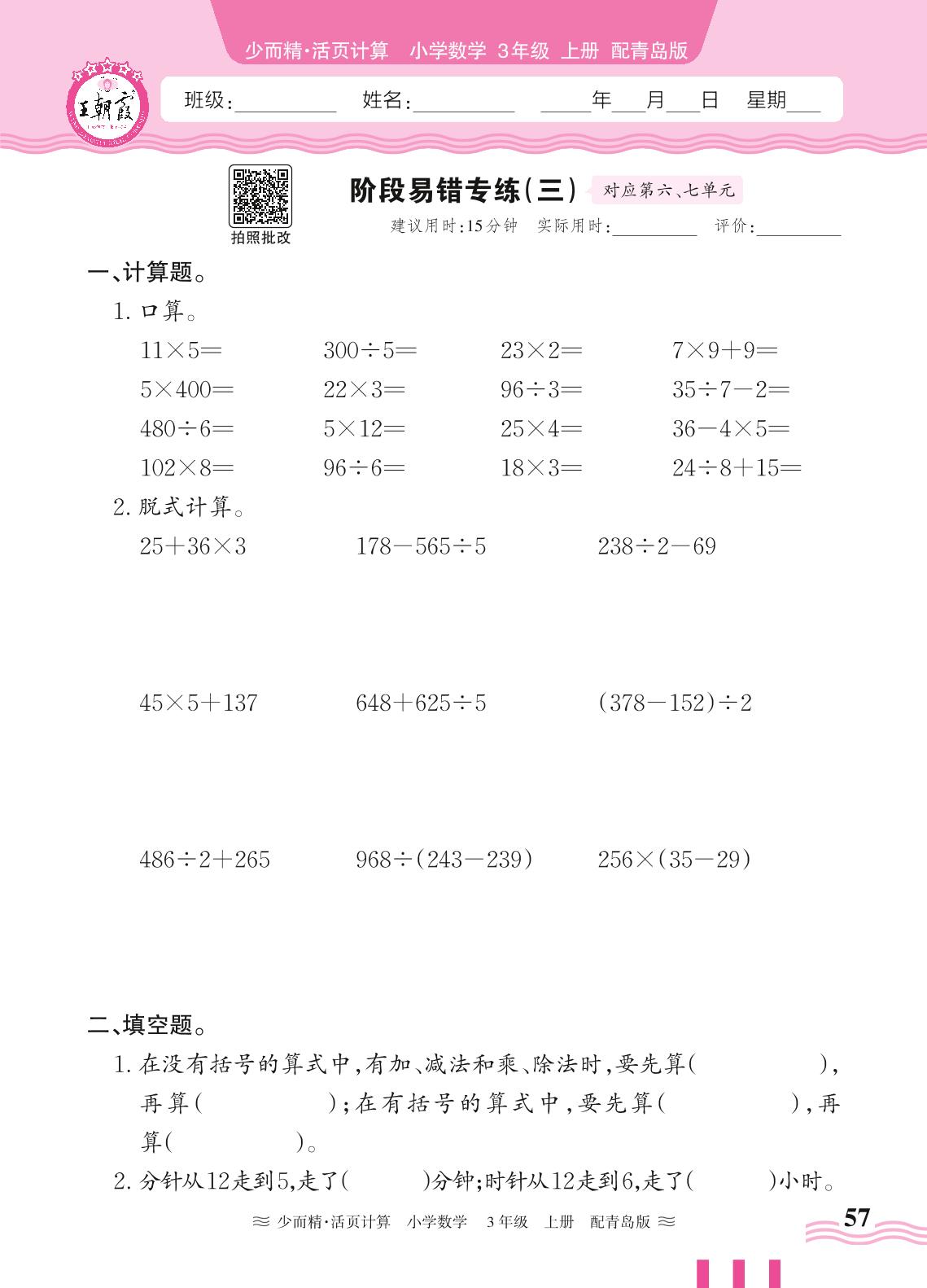 三年级数学青岛版上册专项卷