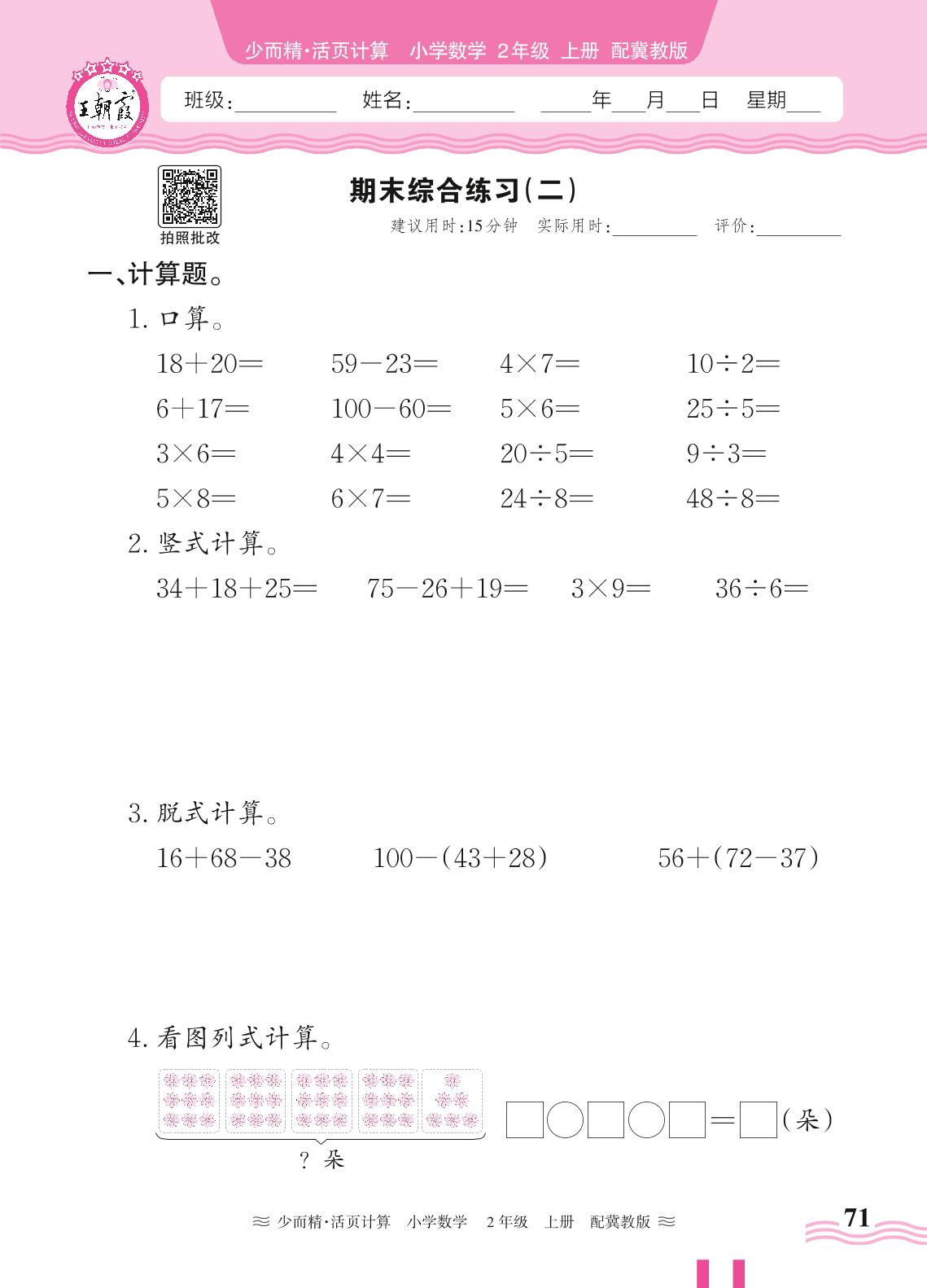 2024秋上册二年级数学冀教版 期末综合练习(二)(计算专练)