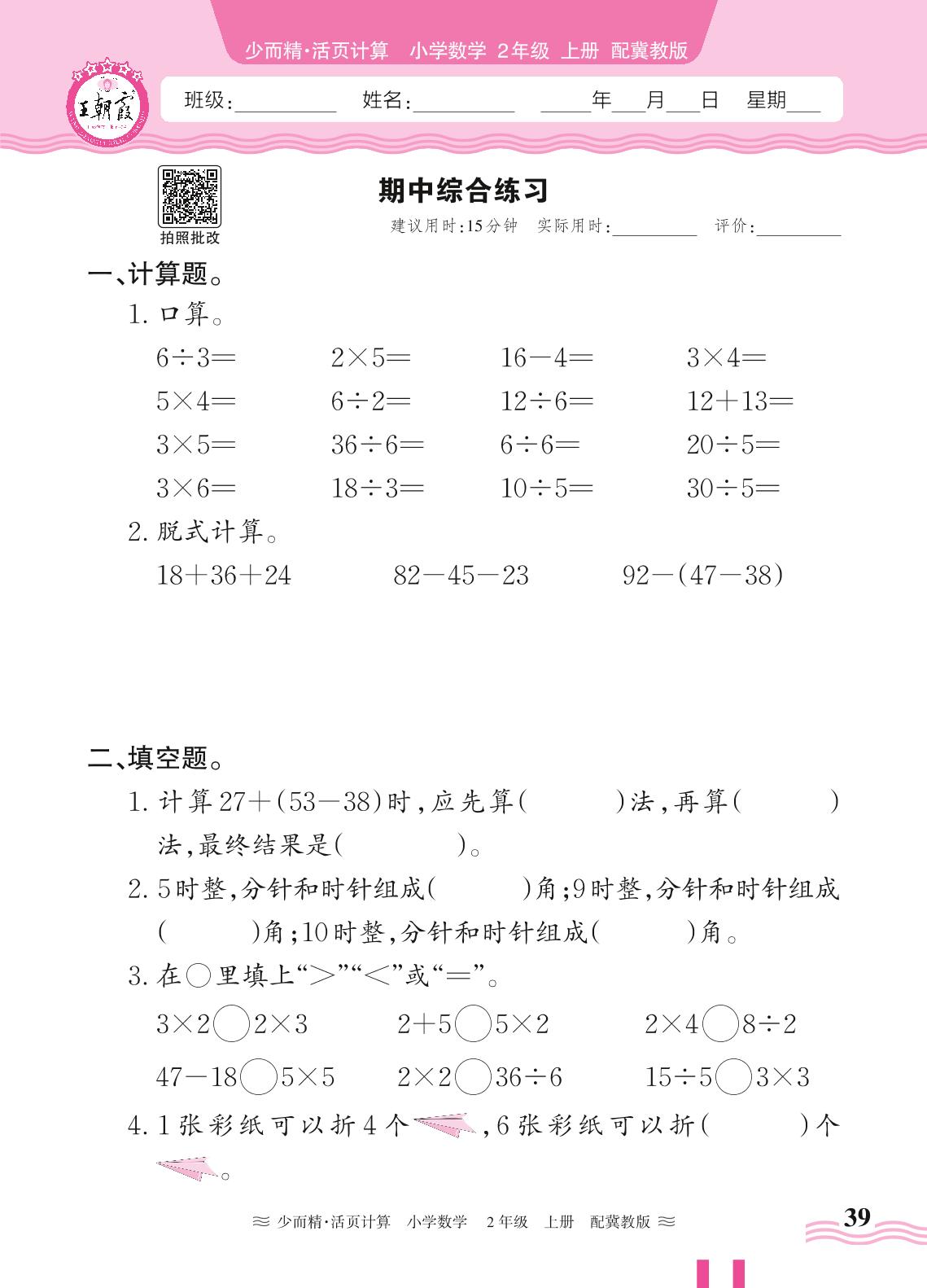 2024秋上册二年级数学冀教版 期中综合练习(计算专练)
