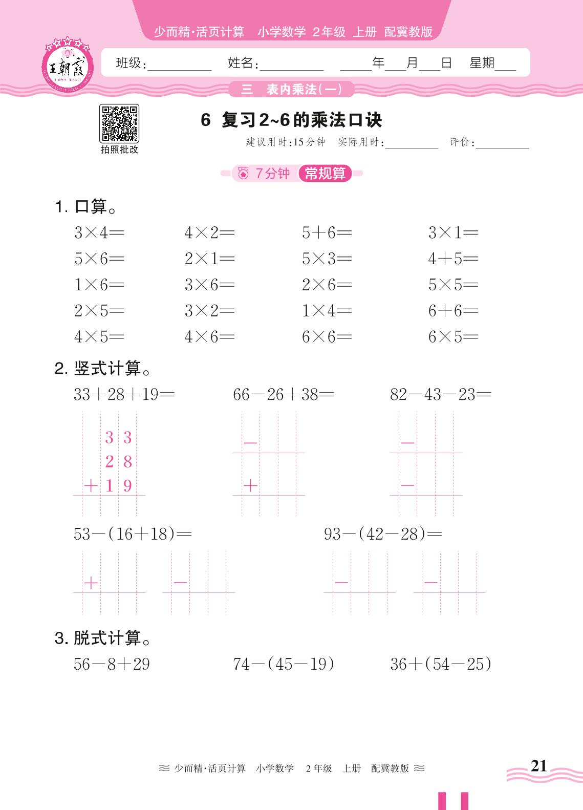 2024秋上册二年级数学冀教版 第三单元 表内乘法(一)——6. 复习2~6的乘法口诀