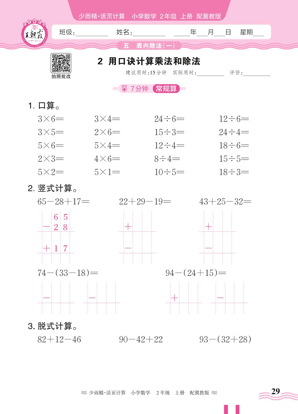 2024秋上册二年级数学冀教版 第五单元 表内除法(一)——2. 用口诀计算乘法和除法