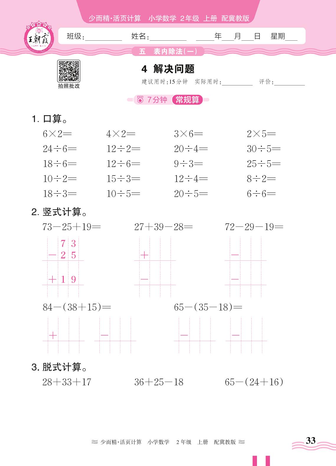 2024秋上册二年级数学冀教版 第五单元 表内除法(一)——4. 解决问题