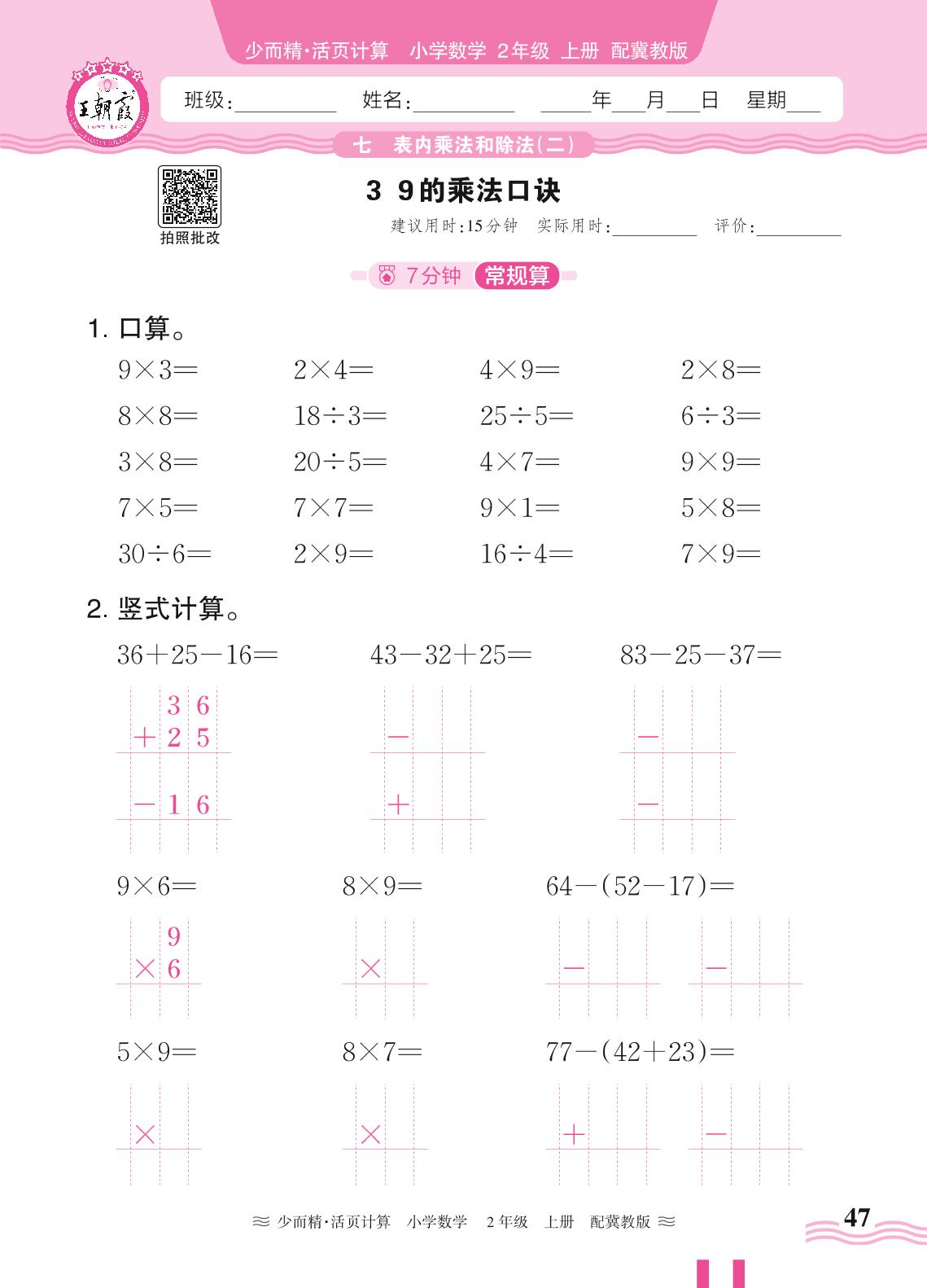 2024秋上册二年级数学冀教版 第七单元 表内乘法和除法(二)——3. 9的乘法口诀
