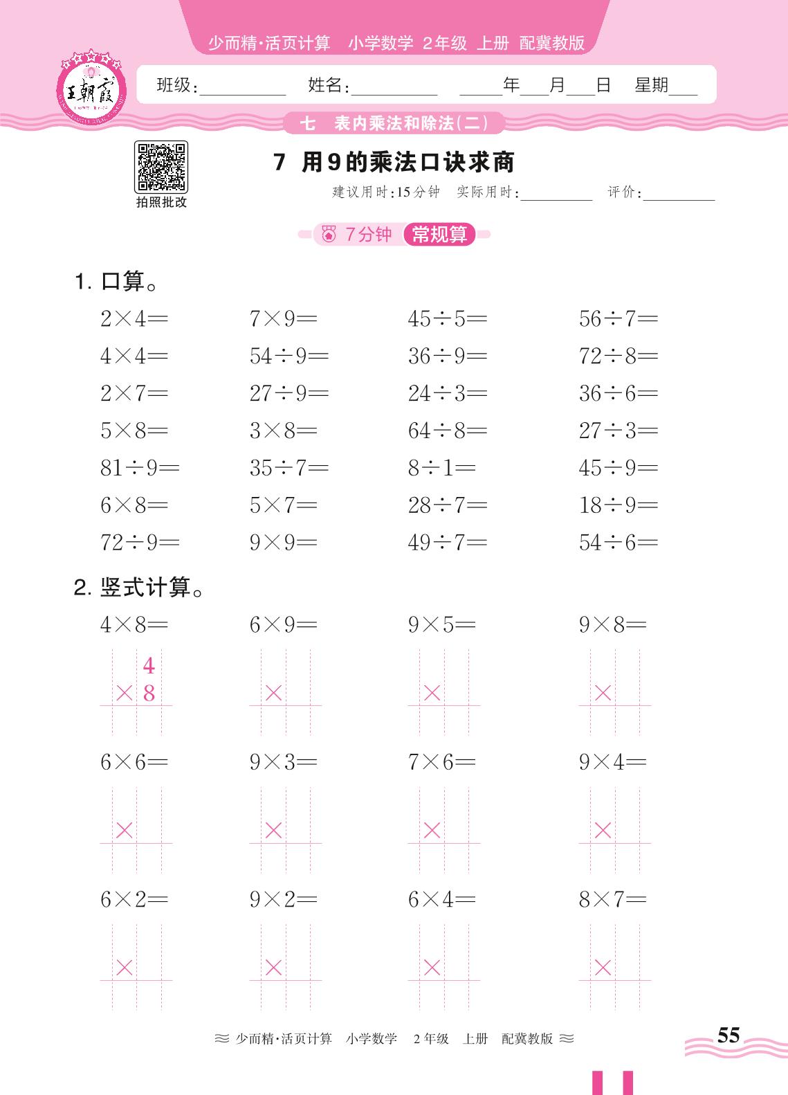 2024秋上册二年级数学冀教版 第七单元 表内乘法和除法(二)——7. 用9的乘法口诀求商