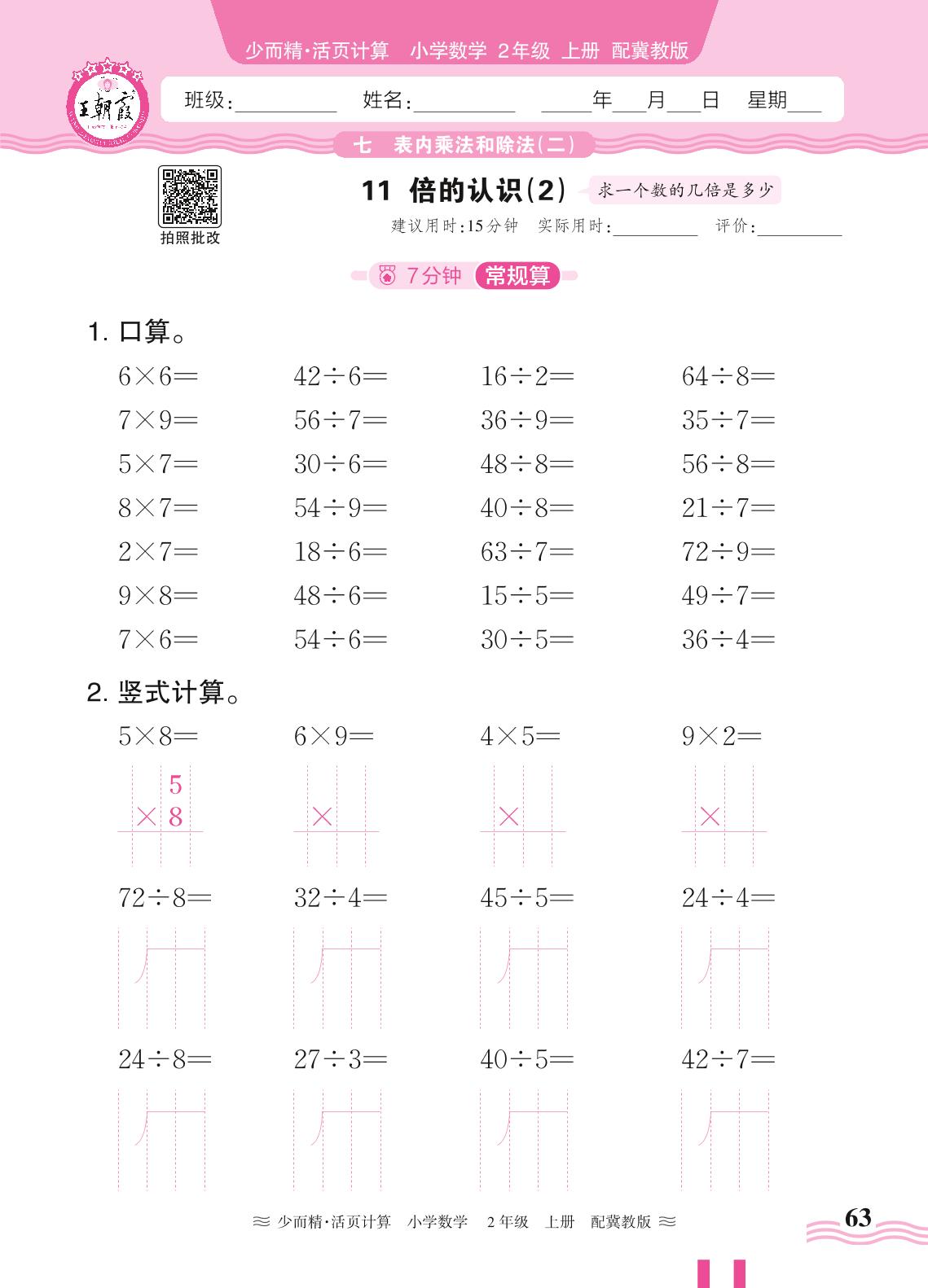2024秋上册二年级数学冀教版 第七单元 表内乘法和除法(二)——11. 倍的认识(2)