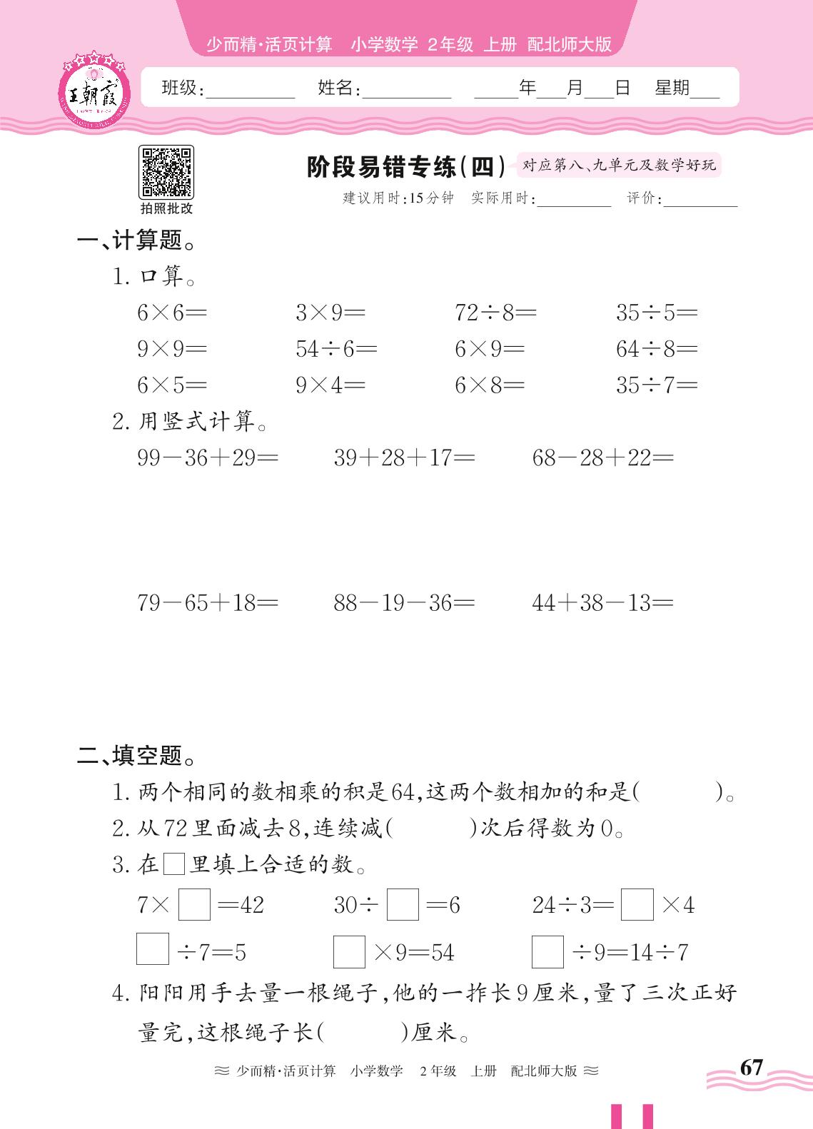 2024秋上册二年级数学北师版 第八、九单元及数学好玩 阶段易错专练