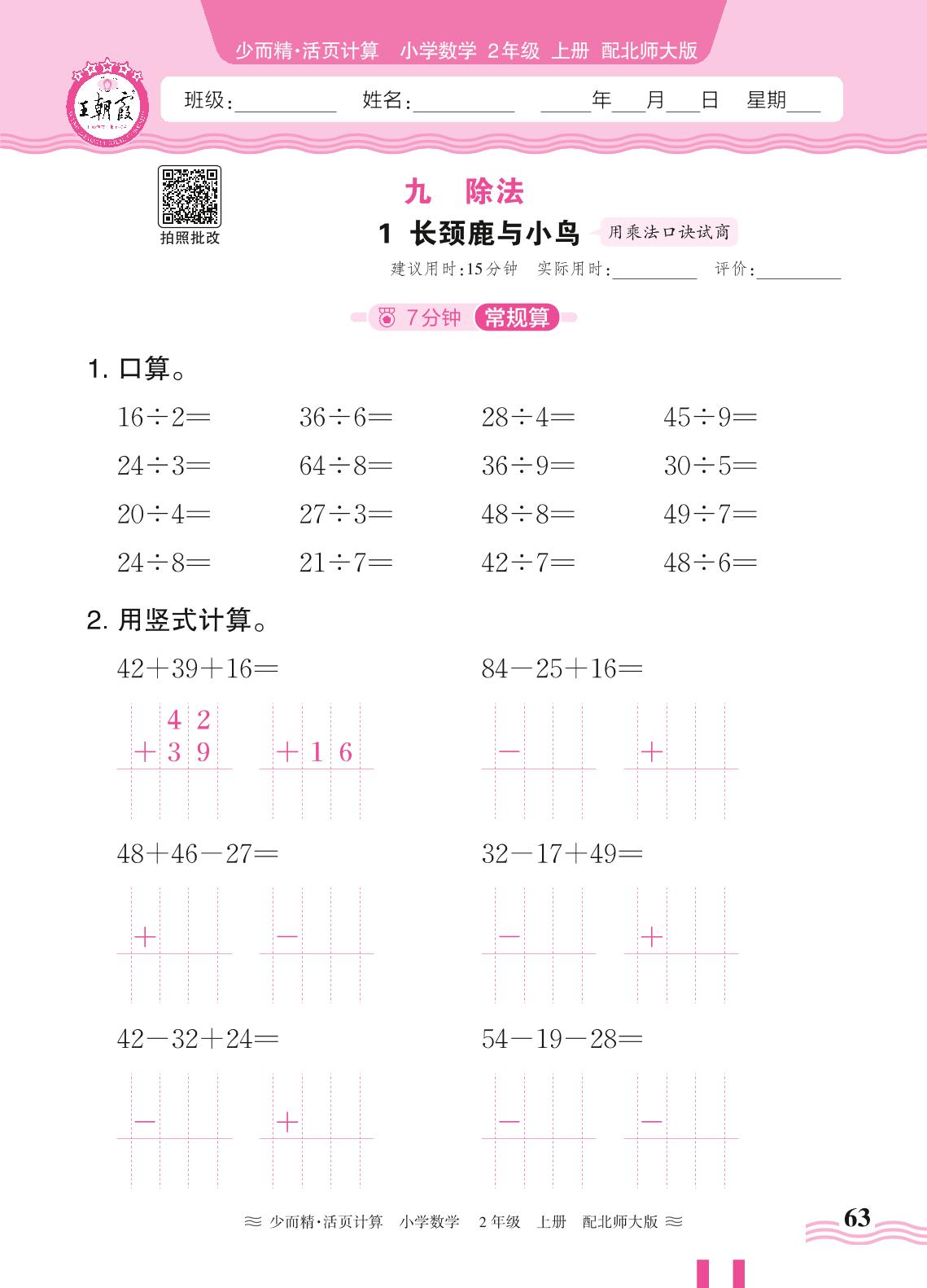 2024秋上册二年级数学北师版 第九单元 除法——1. 长颈鹿与小鸟