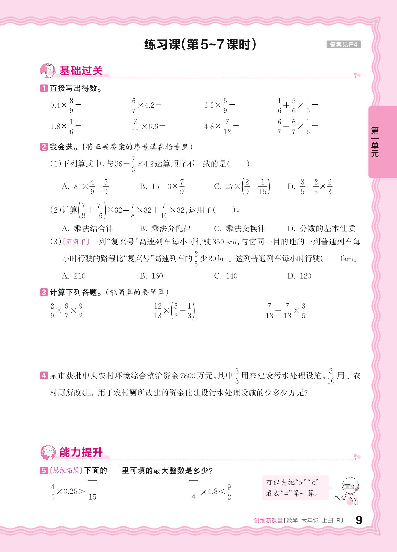 2024秋上册六年级数学人教版 第一单元 分数乘法——分数乘小数、分数乘法混合、整数乘法运算律推广到分数运算练习课