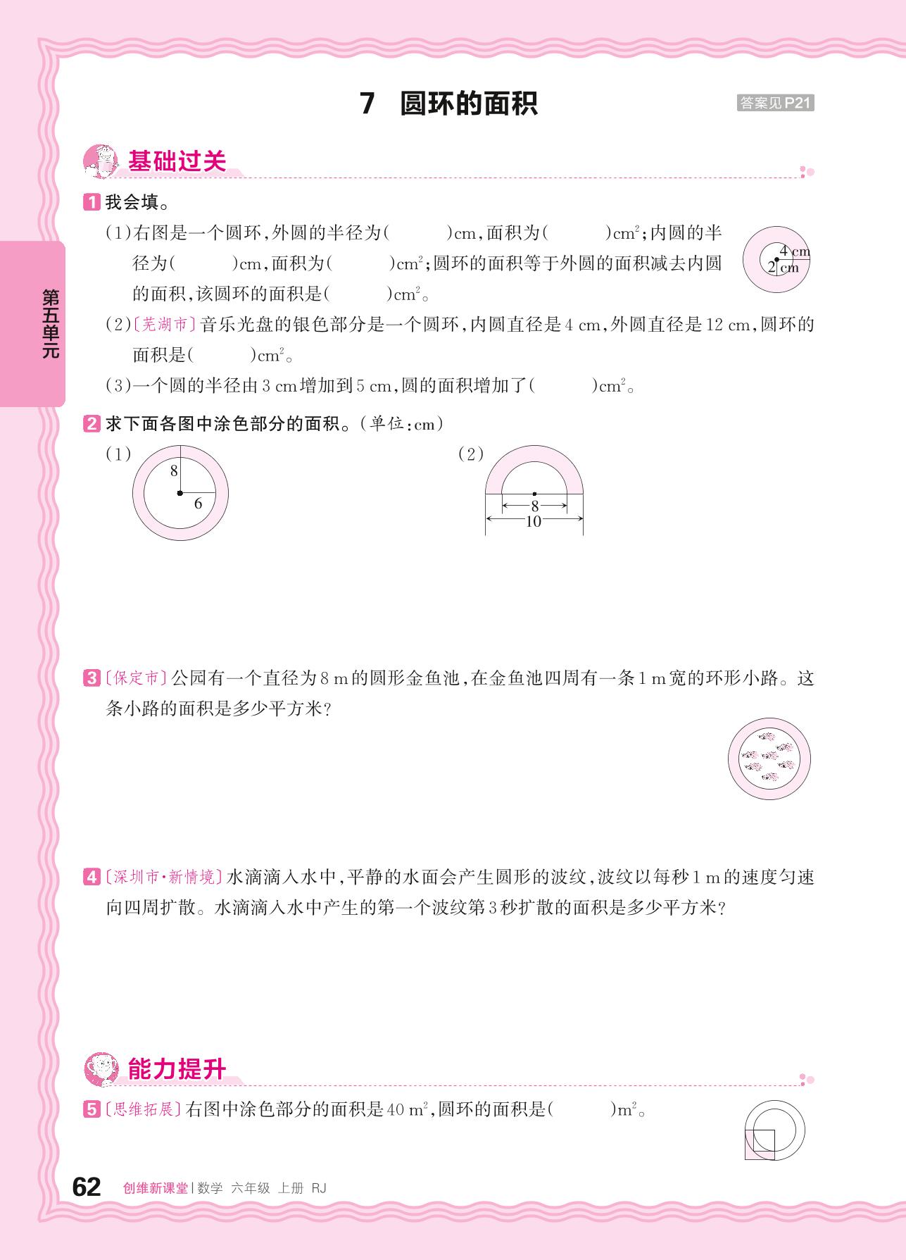 2024秋上册六年级数学人教版 第五单元 圆——7. 圆环的面积