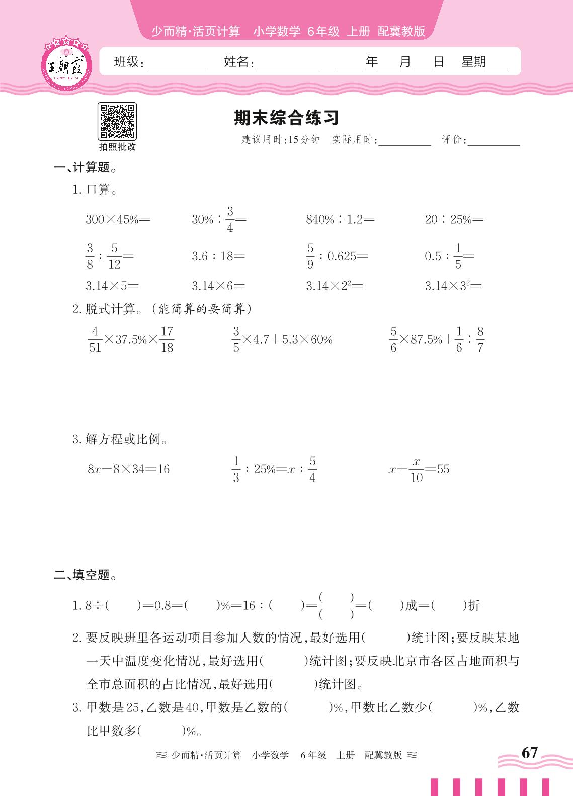 2024秋上册六年级数学冀教版 期末综合练习(计算专练)