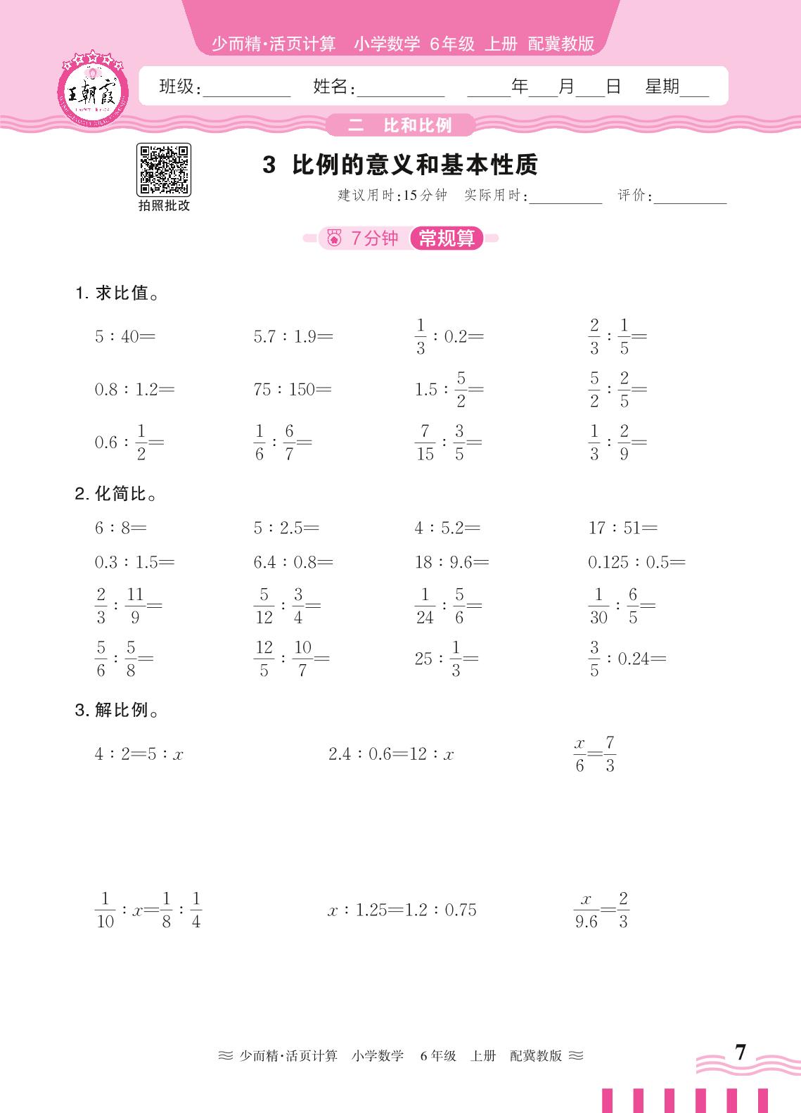 2024秋上册六年级数学冀教版 第二单元 比和比例——3. 比例的意义和基本性质