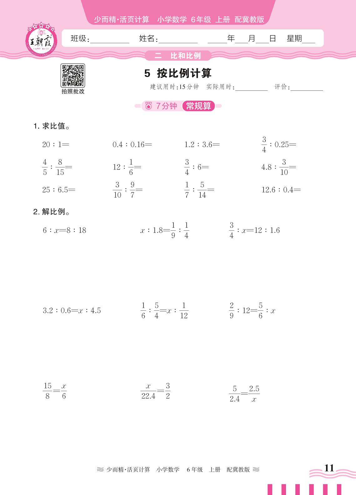 2024秋上册六年级数学冀教版 第二单元 比和比例——5. 按比例计算