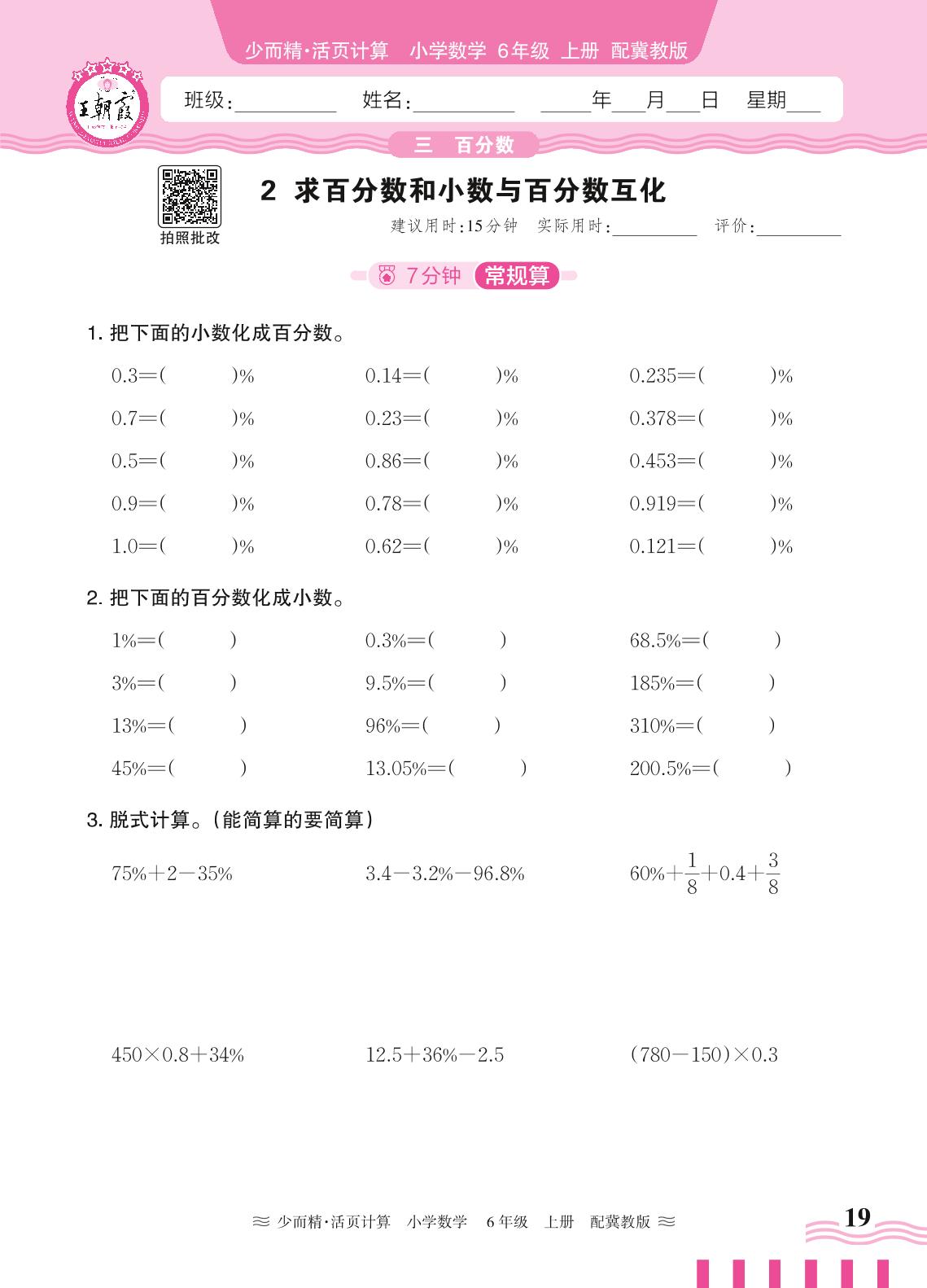 2024秋上册六年级数学冀教版 第三单元 百分数——2. 求百分数和小数与百分数互化