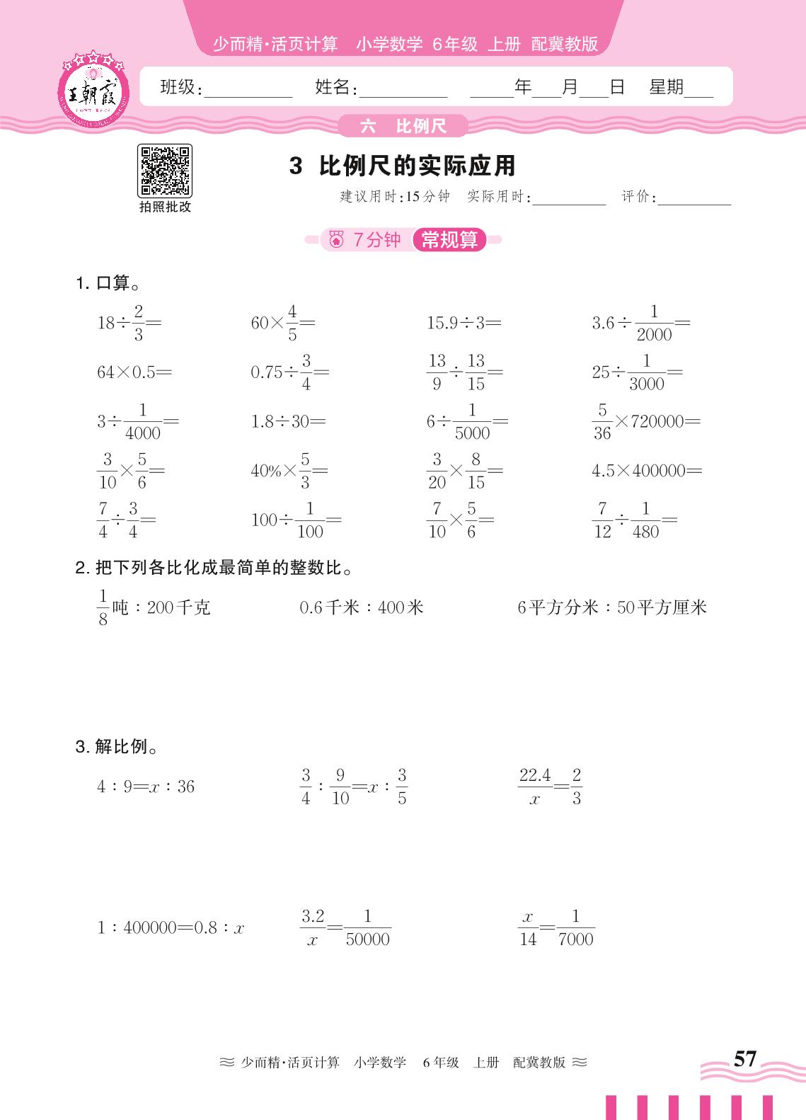 2024秋上册六年级数学冀教版 第六单元 比例尺——3. 比例尺的实际应用