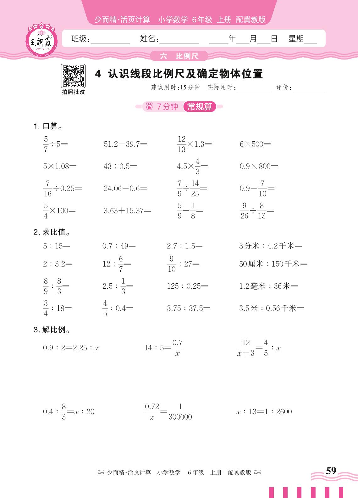 2024秋上册六年级数学冀教版 第六单元 比例尺——4. 认识线段比例尺及确定物体位置