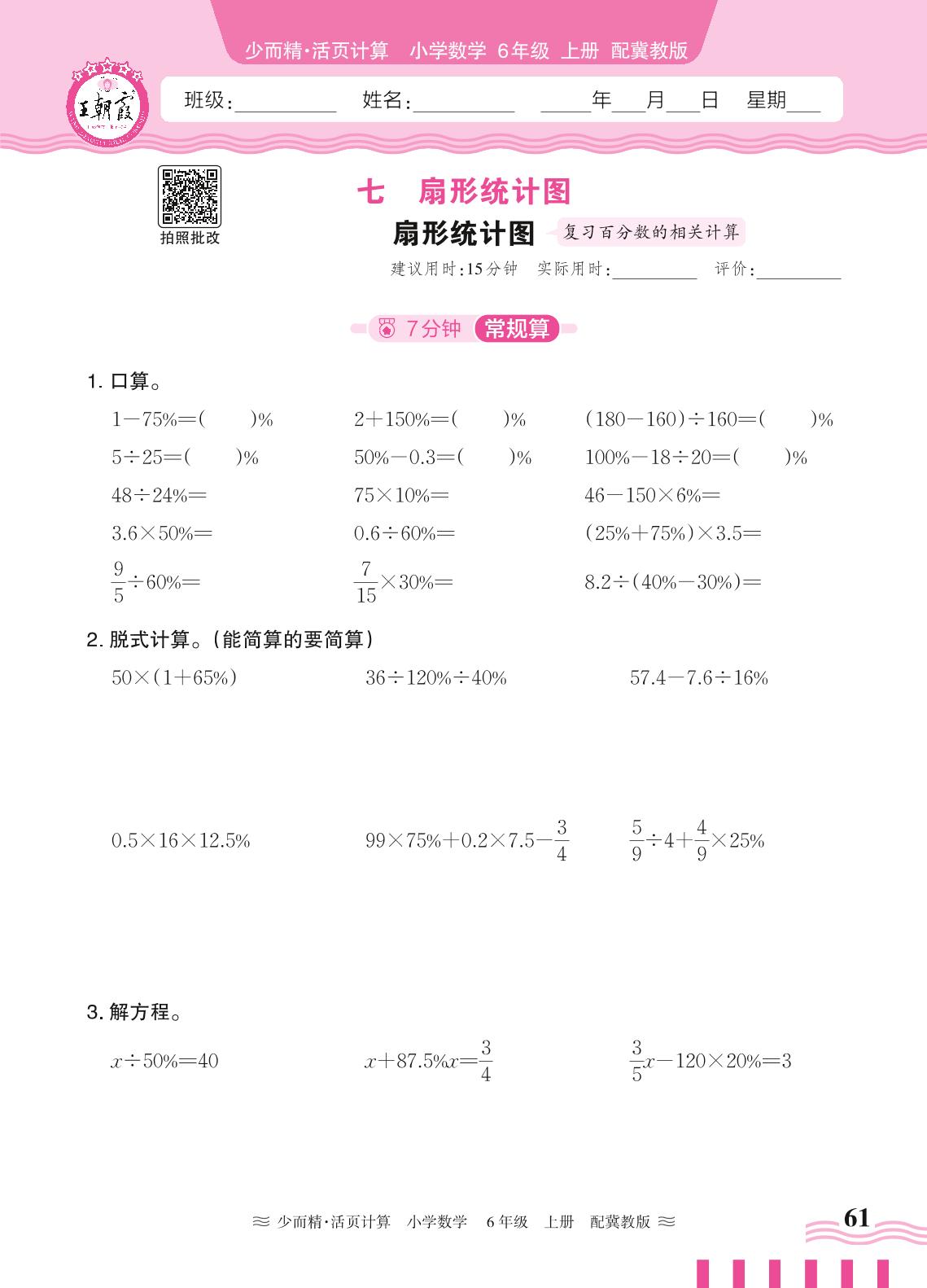六年级数学冀教版上册课时作业