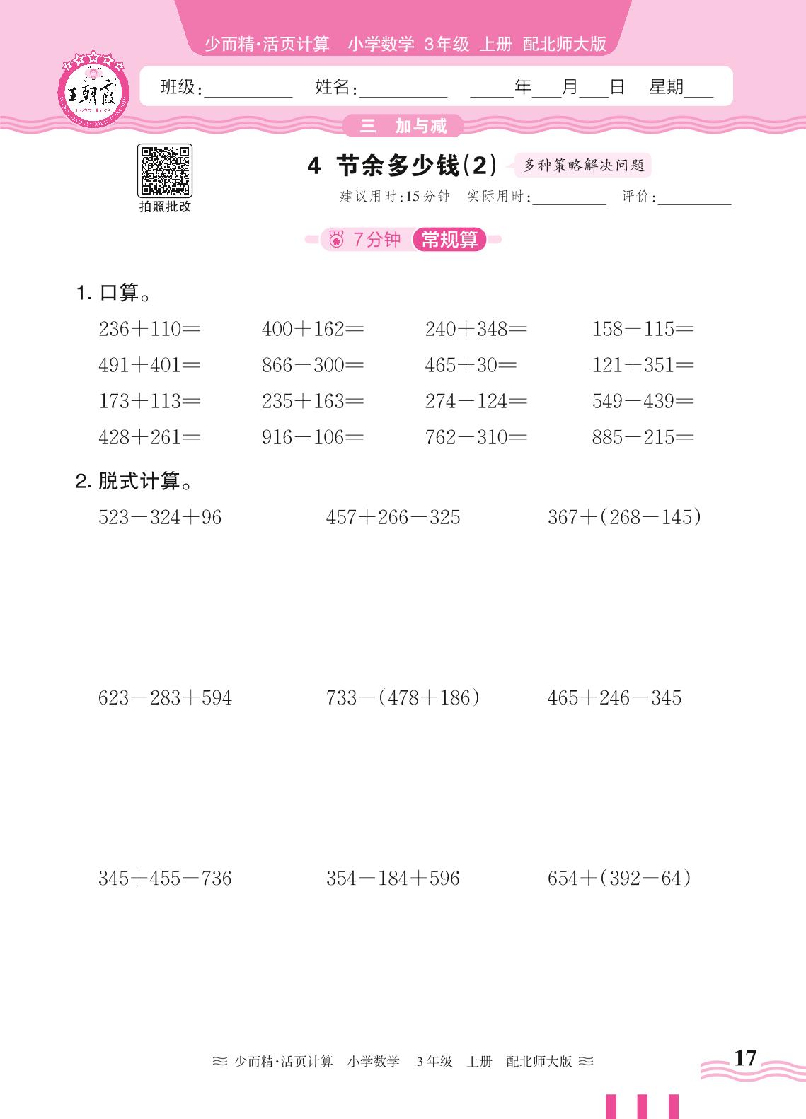 2024秋上册三年级数学北师版 第三单元 加与减——4. 节余多少钱(2)_R240819095318010