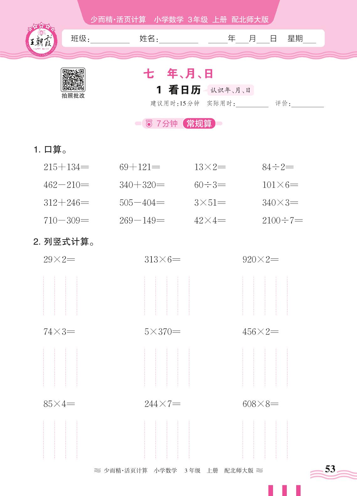 2024秋上册三年级数学北师版 第七单元 年、月、日——1. 看日历