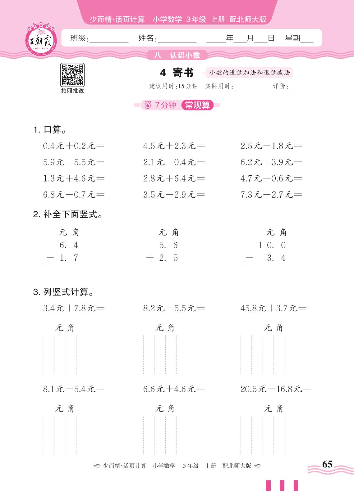 2024秋上册三年级数学北师版 第八单元 认识小数——4. 寄书_R240819095327436