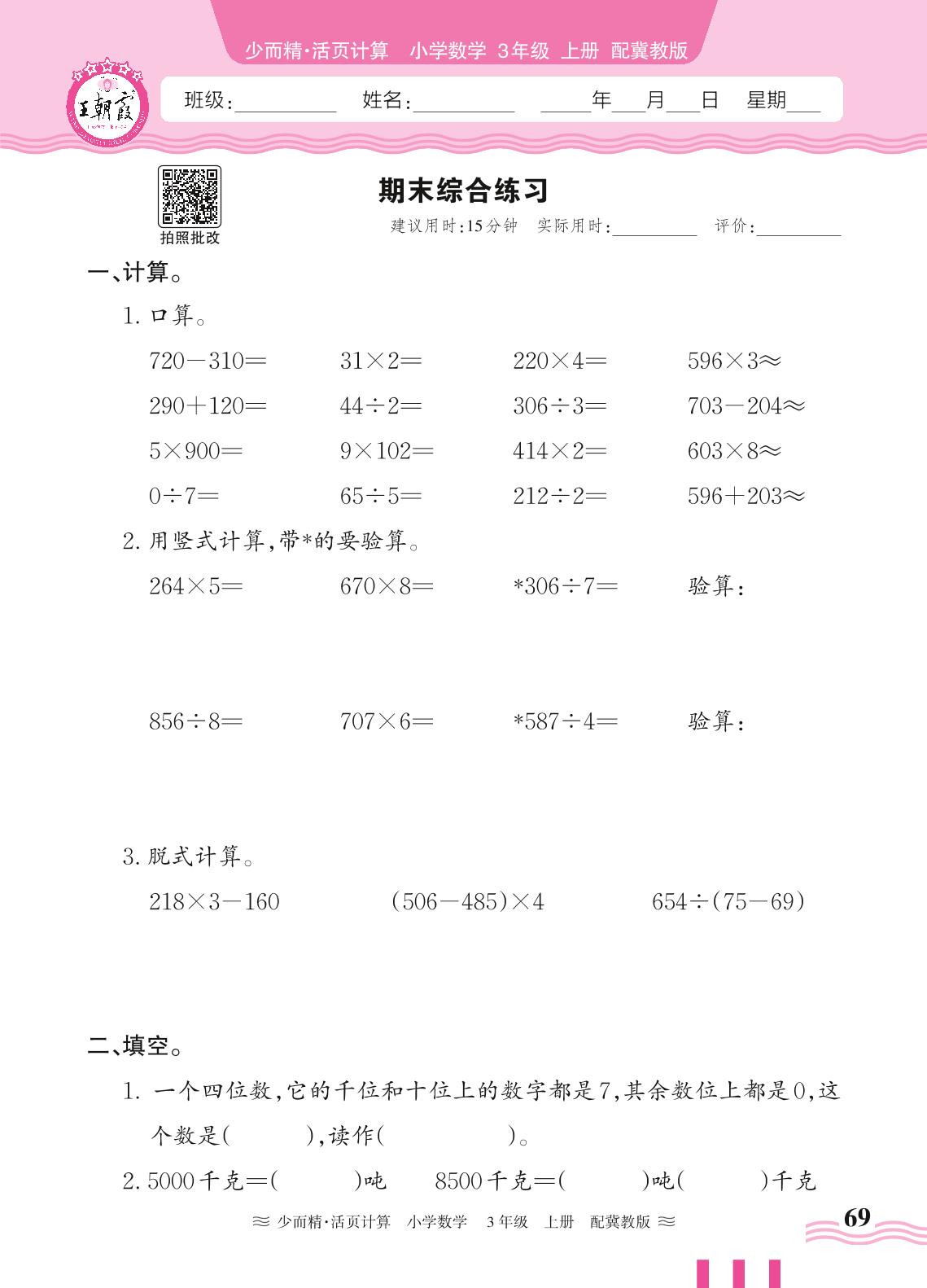 2024秋上册三年级数学冀教版 期末综合练习(计算专练)
