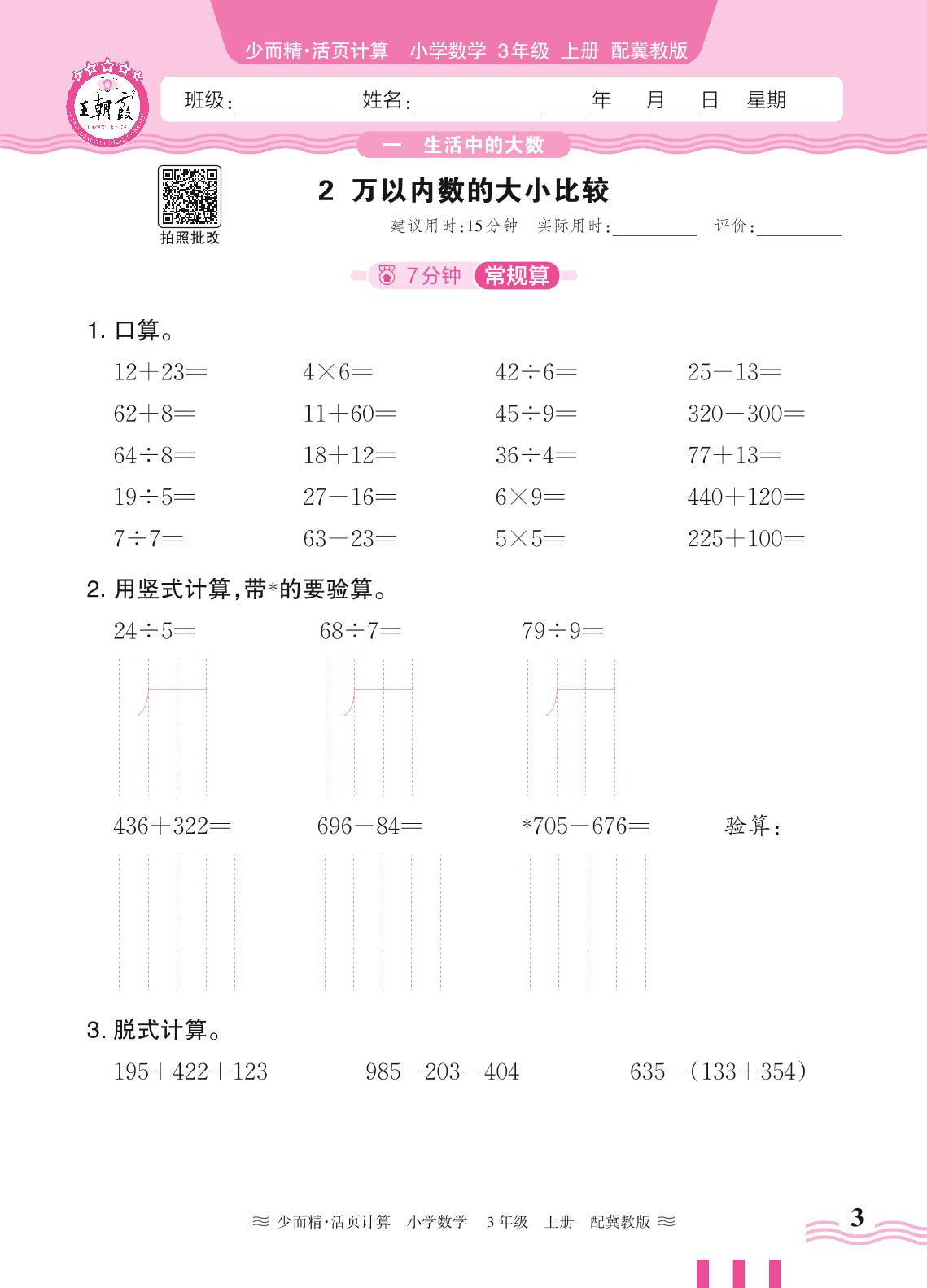 三年级数学冀教版上册课时作业