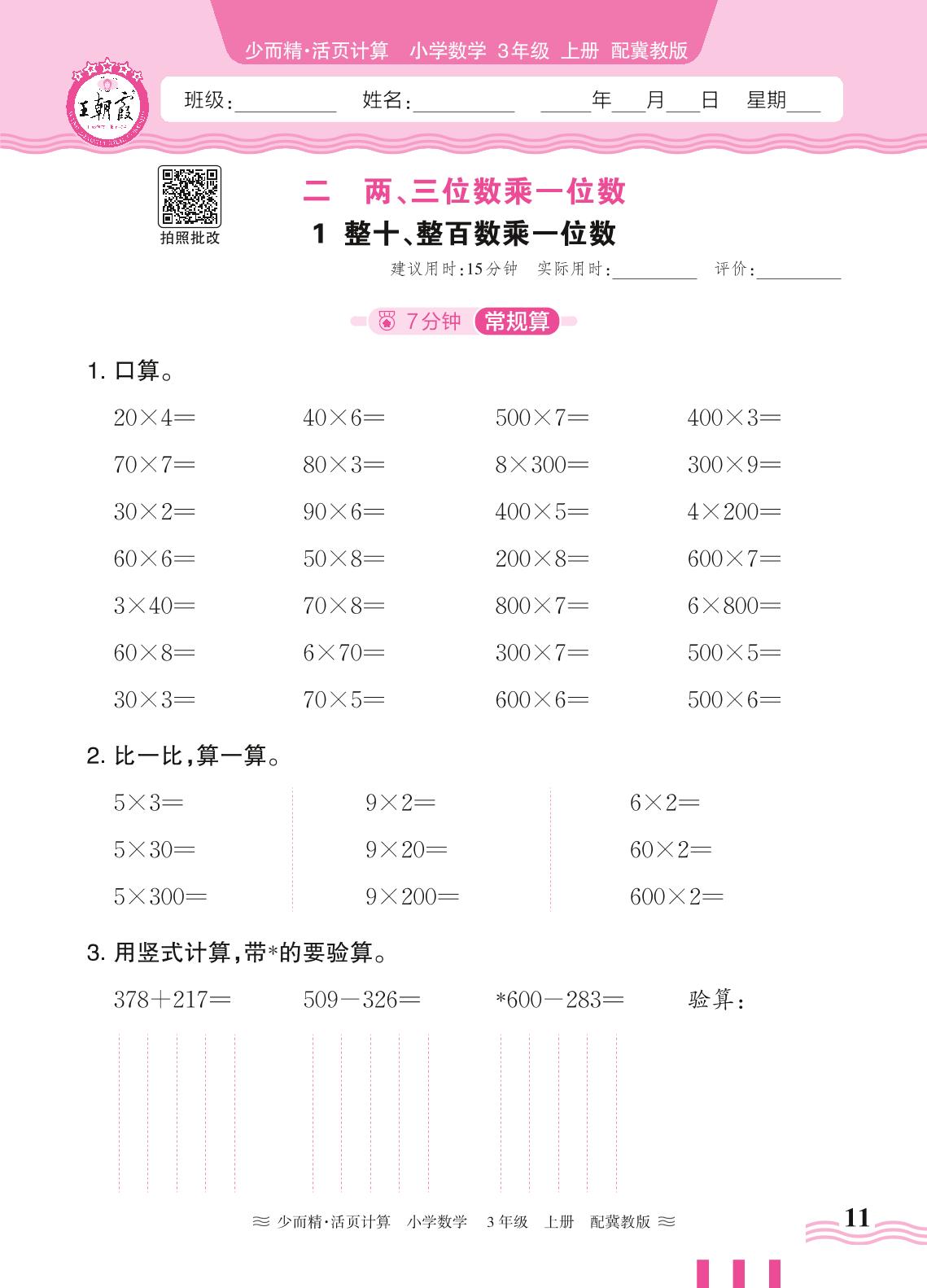 2024秋上册三年级数学冀教版 第二单元 两、三位数乘—位数——1. 整十、整百数乘一位数