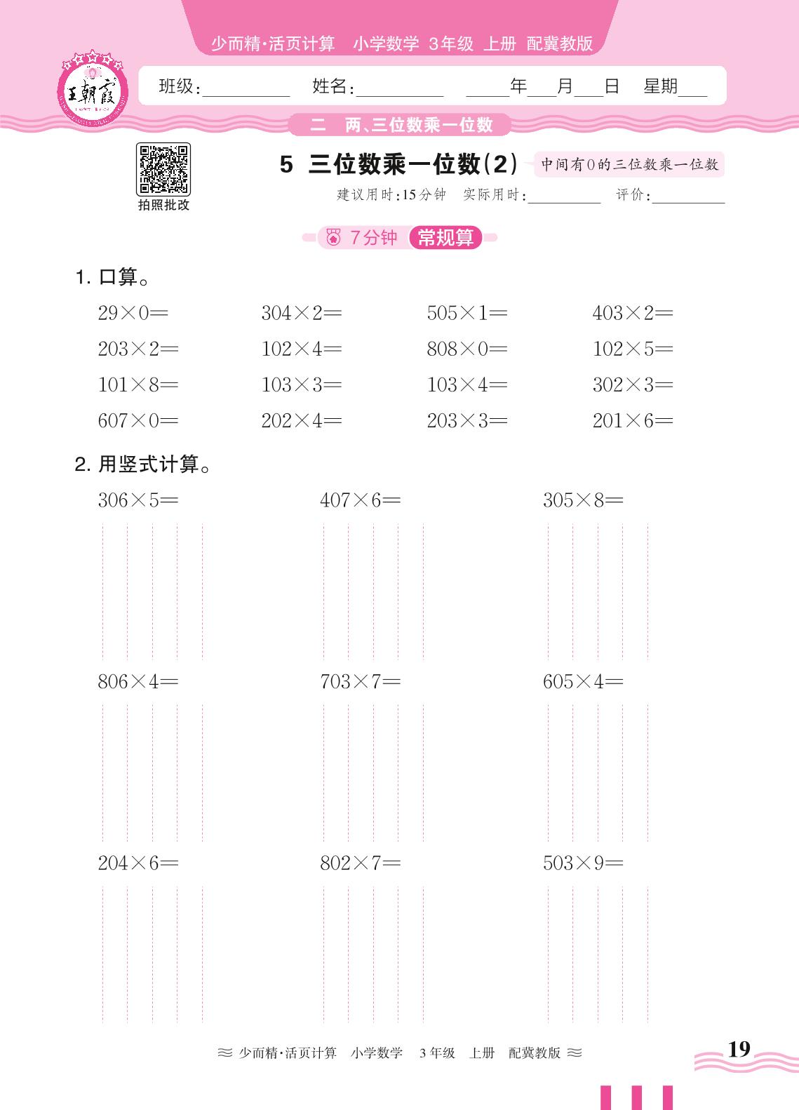 2024秋上册三年级数学冀教版 第二单元 两、三位数乘—位数——5. 三位数乘一位数(2)