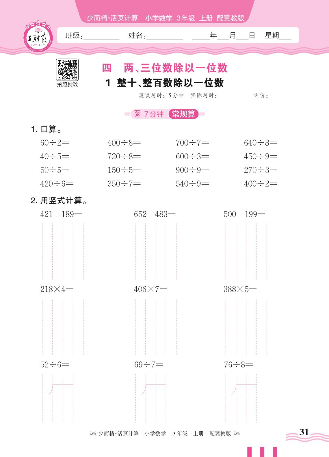 2024秋上册三年级数学冀教版 第四单元 两、三位数除以一位数——1. 整十、整百数除以一位数