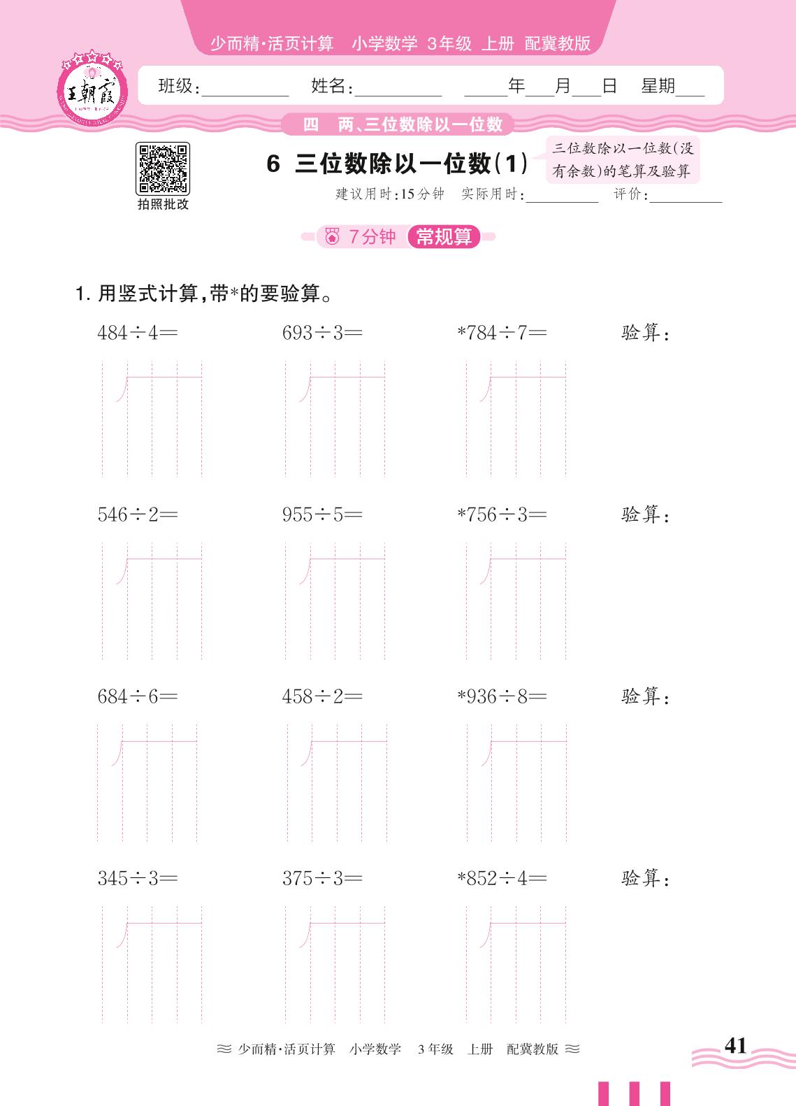 2024秋上册三年级数学冀教版 第四单元 两、三位数除以一位数——6. 三位数除以一位数(1)