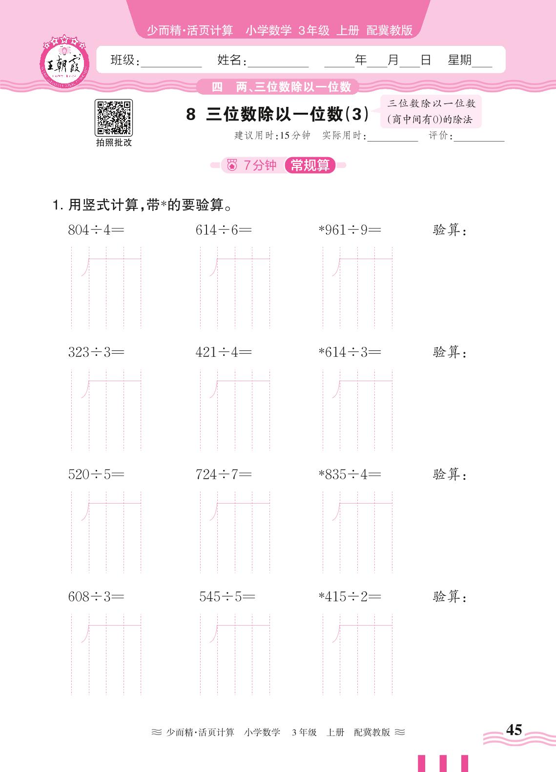 2024秋上册三年级数学冀教版 第四单元 两、三位数除以一位数——8. 三位数除以一位数(3)