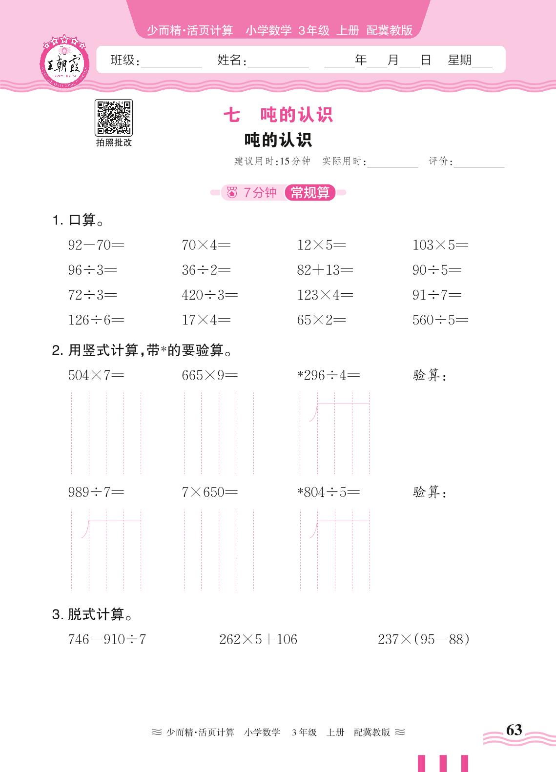 2024秋上册三年级数学冀教版 第七单元 吨的认识——吨的认识