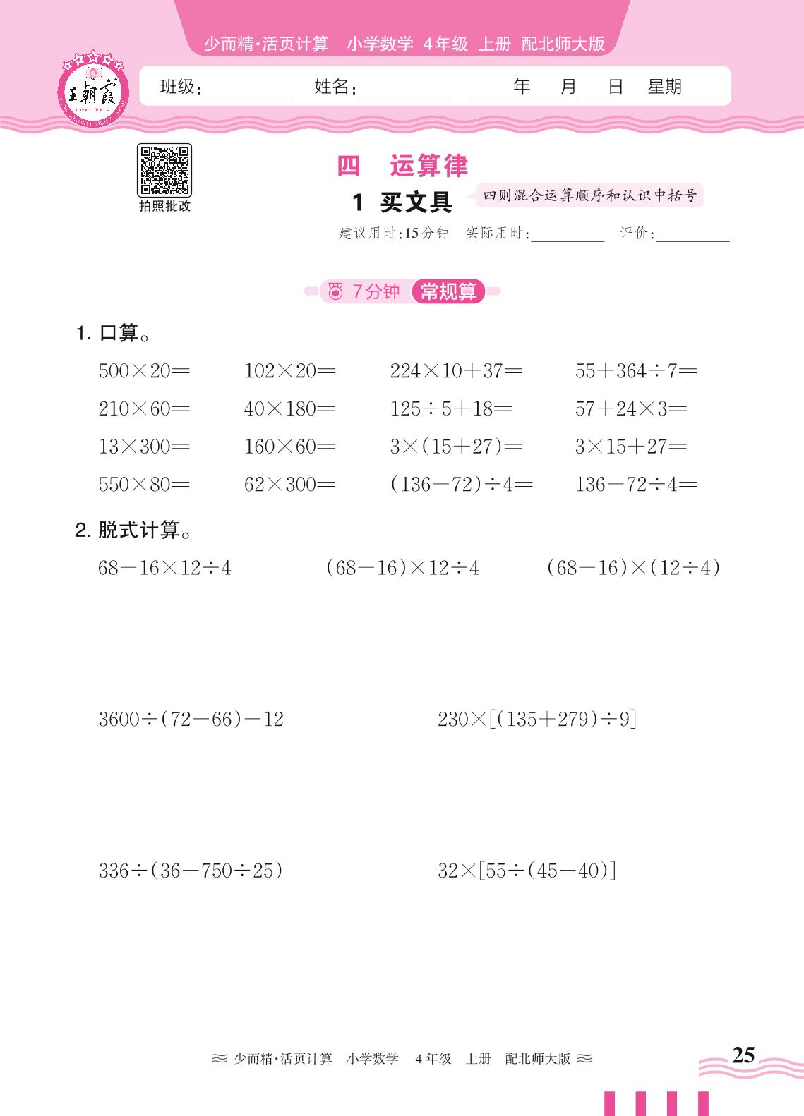 2024秋上册四年级数学北师版 第四单元 运算律——1. 买文具