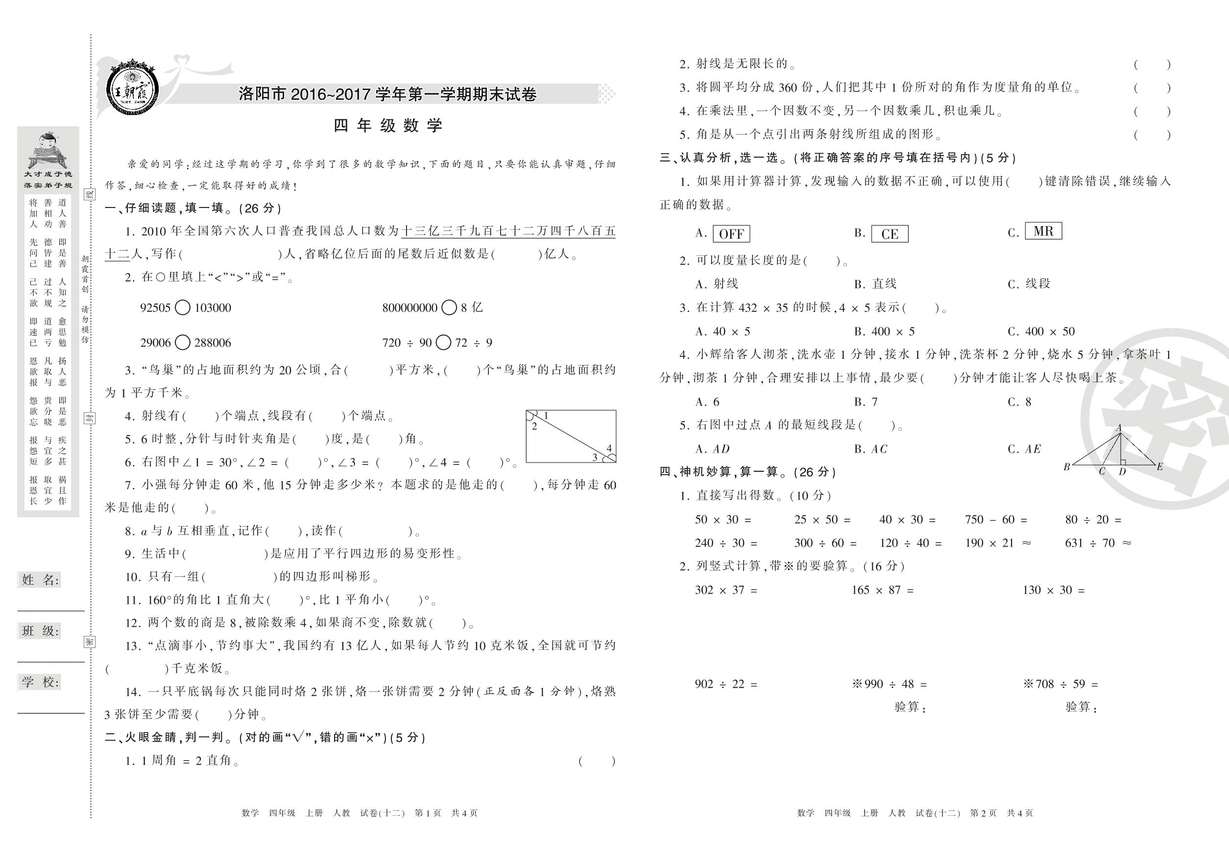 2016-2017学年第一学期洛阳市四年级数学试卷(人教版)【12】