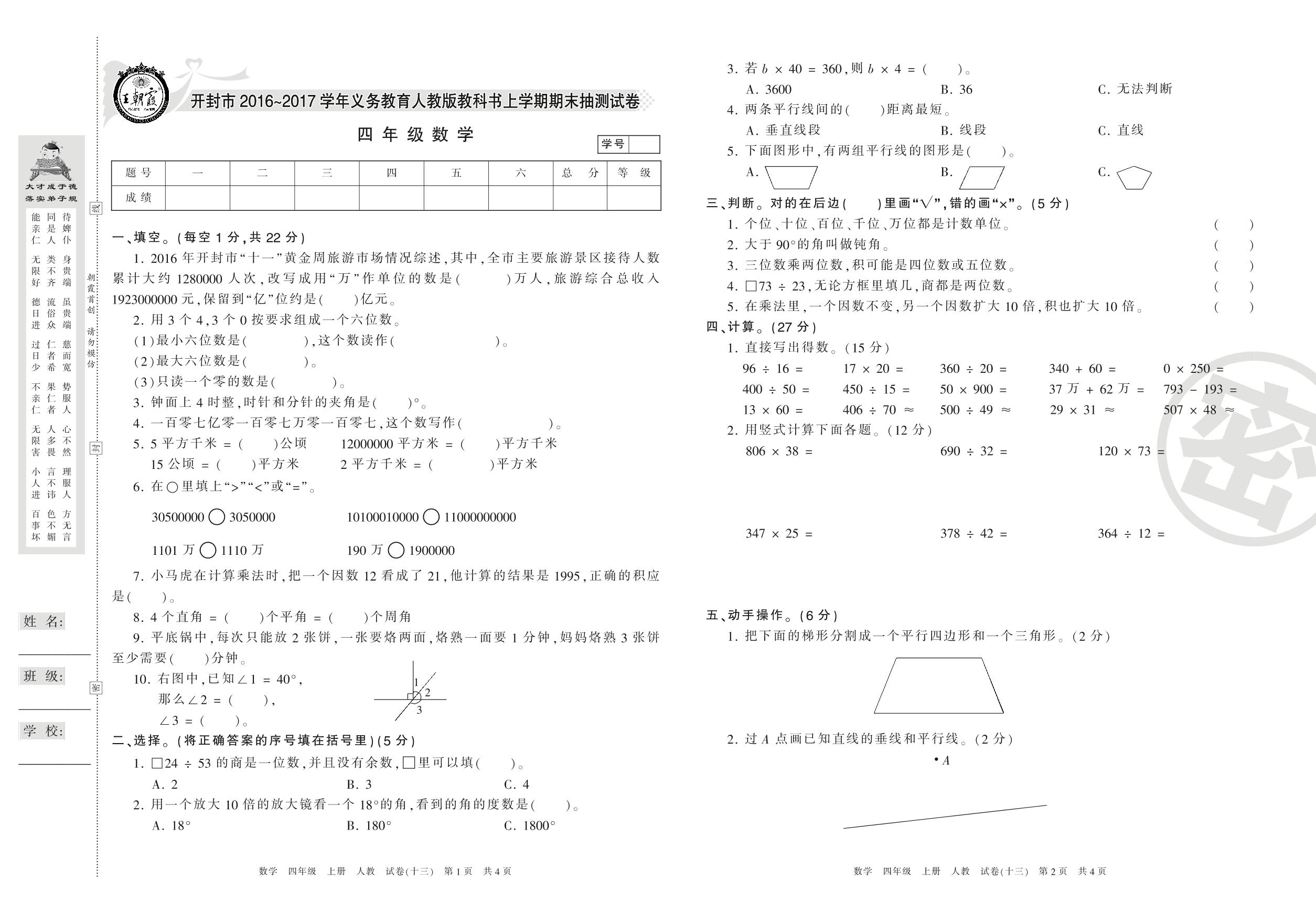 2016-2017学年第一学期开封市四年级数学试卷(人教版)【13】
