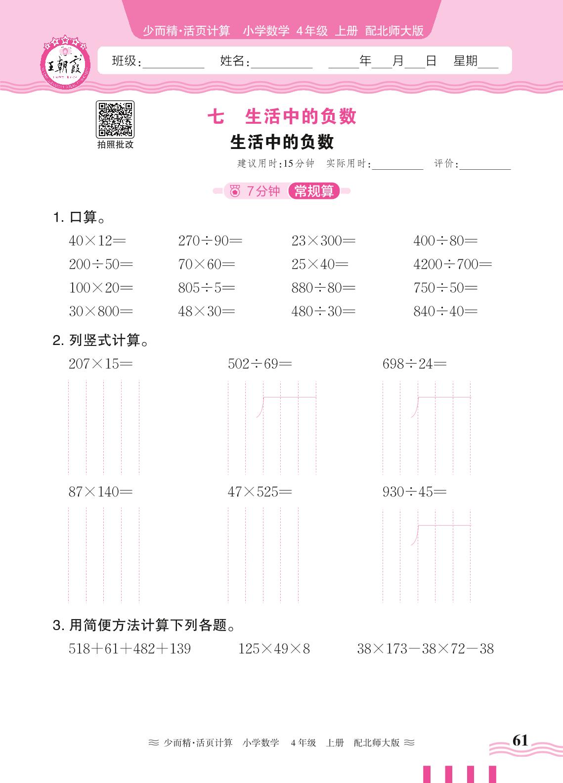 2024秋上册四年级数学北师版 第七单元 生活中的负数——生活中的负数